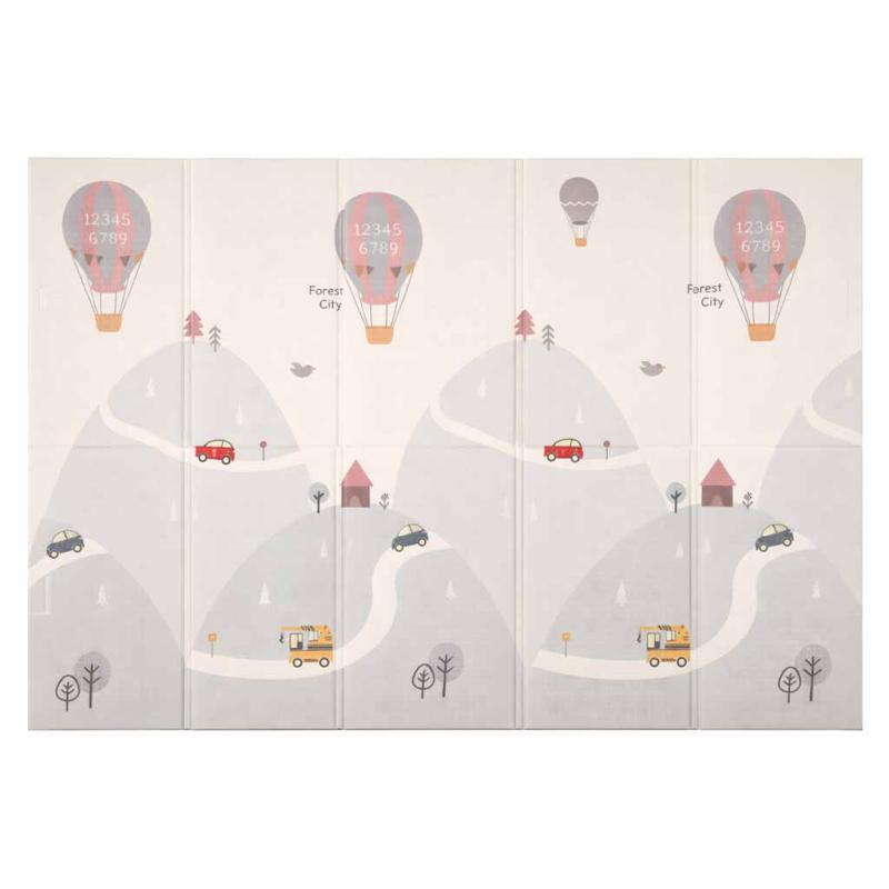 Dwustronny motyw: z jednej strony ulica z samochodzikami, z drugiej pastelowy krajobraz z balonami — zachęca do kreatywnych zabaw, tworzenia scenek i nauki orientacji przestrzennej. Kolorystyka w odcieniach błękitu, szarości i wielobarwna grafika wpisują się w nowoczesne wnętrza, nie dominując przestrzeni.