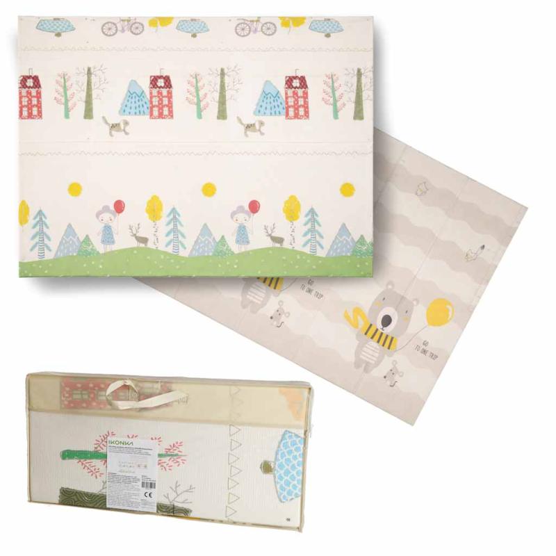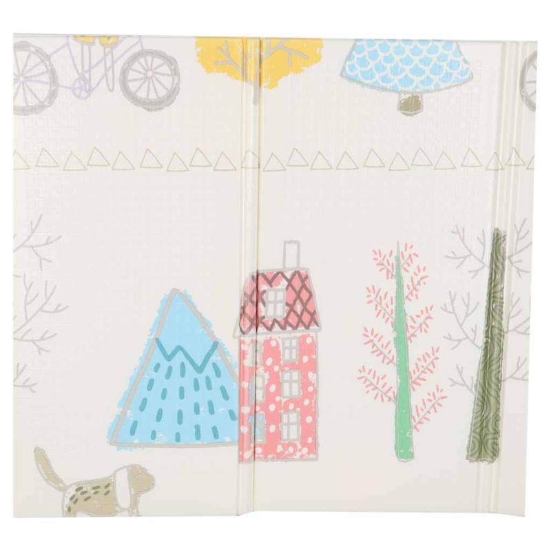 Dzięki niewielkiej grubości 1 cm mata zapewnia komfort termiczny i jednocześnie pozostaje na tyle zwarta, że ułatwia utrzymanie równowagi. Dwustronny wzór z motywem drzew i misiów łączący biały i wielobarwny design sprawia, że mata dobrze komponuje się z wnętrzem i zachęca dziecko do zabawy.