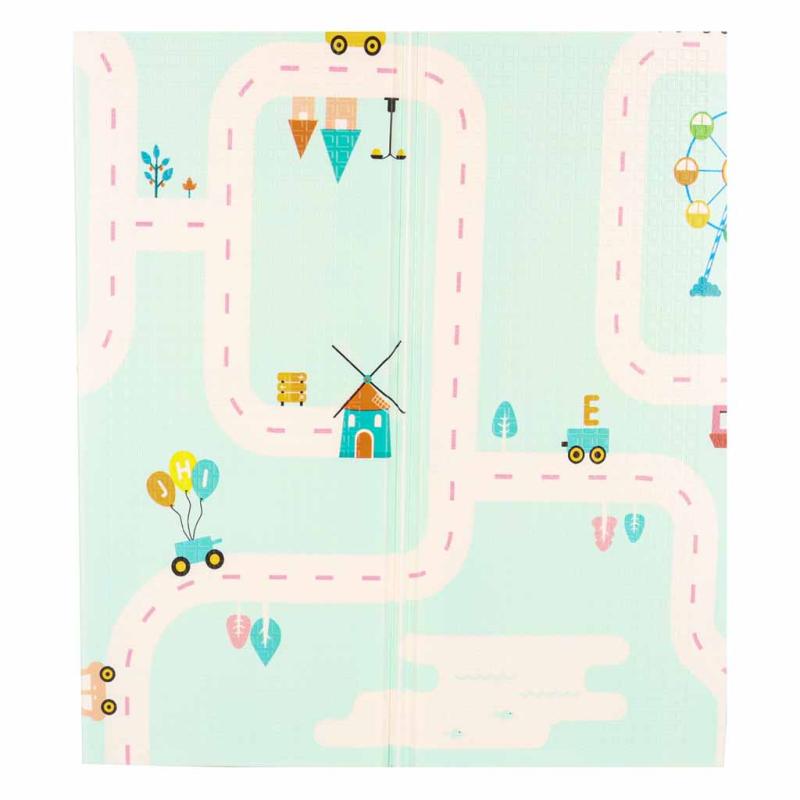 Mata składa się na kilka części, dzięki czemu po złożeniu zajmuje niewiele miejsca i jest lekka. W zestawie znajduje się praktyczna torba z uchwytami, która umożliwia wygodne przenoszenie oraz zabezpiecza matę podczas przechowywania. To rozwiązanie szczególnie cenione przez rodziców, którzy chcą zabierać matę ze sobą do różnych miejsc.