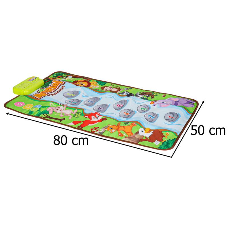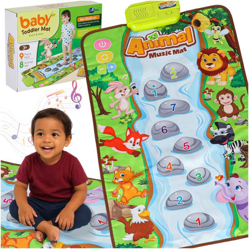 Mata interaktywna grająca muzyczna edukacyjna zwierzątka to mata dla dzieci od 18 miesięcy, reagująca na dotyk dźwiękami zwierząt oraz muzycznymi tonacjami C-Dur. Wymiary maty to 80 × 50 cm, posiada 24 przyciski: 9 pianina, 8 zwierzątek oraz 5 dodatkowych. Zasilanie zapewniają 3 baterie AA (brak w zestawie). Na macie znajdują się przyciski włącz/wyłącz, regulacja głośności oraz zmiana piosenek, a także plastikowy panel z suwakiem ON/OFF. Produkt wykonano z plastiku, poliestru i komponentów elektronicznych, zapakowany w kartonowe pudełko.
