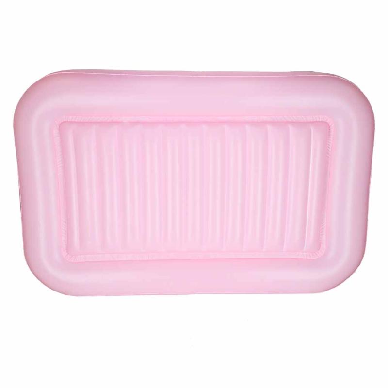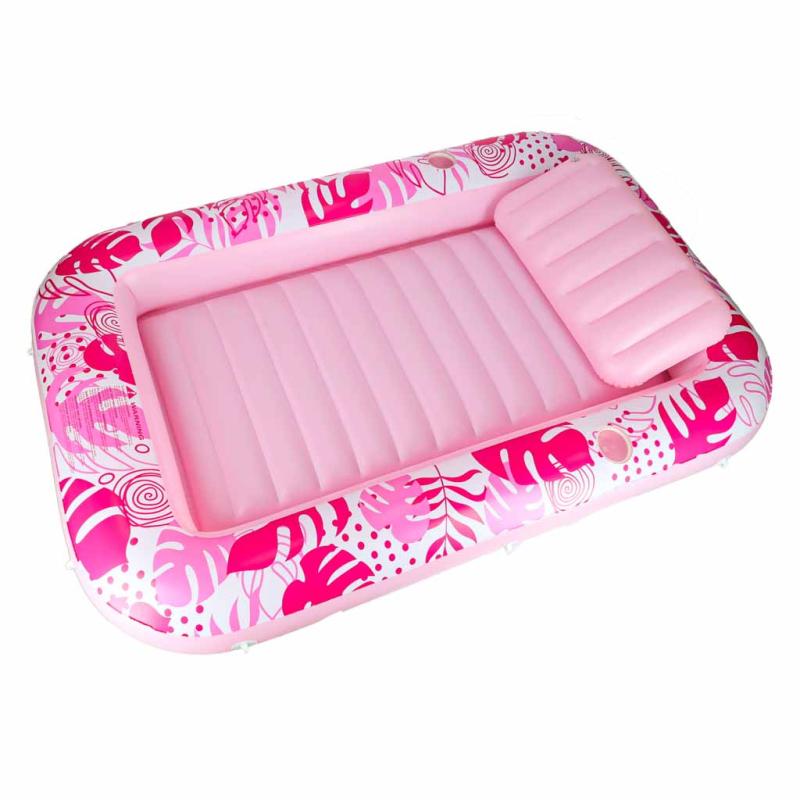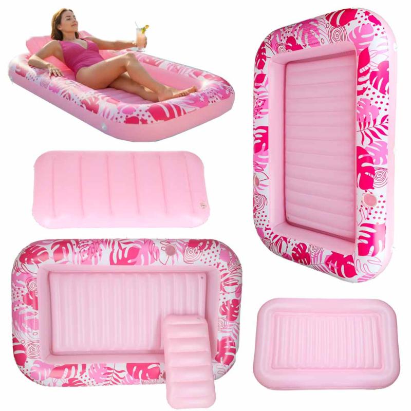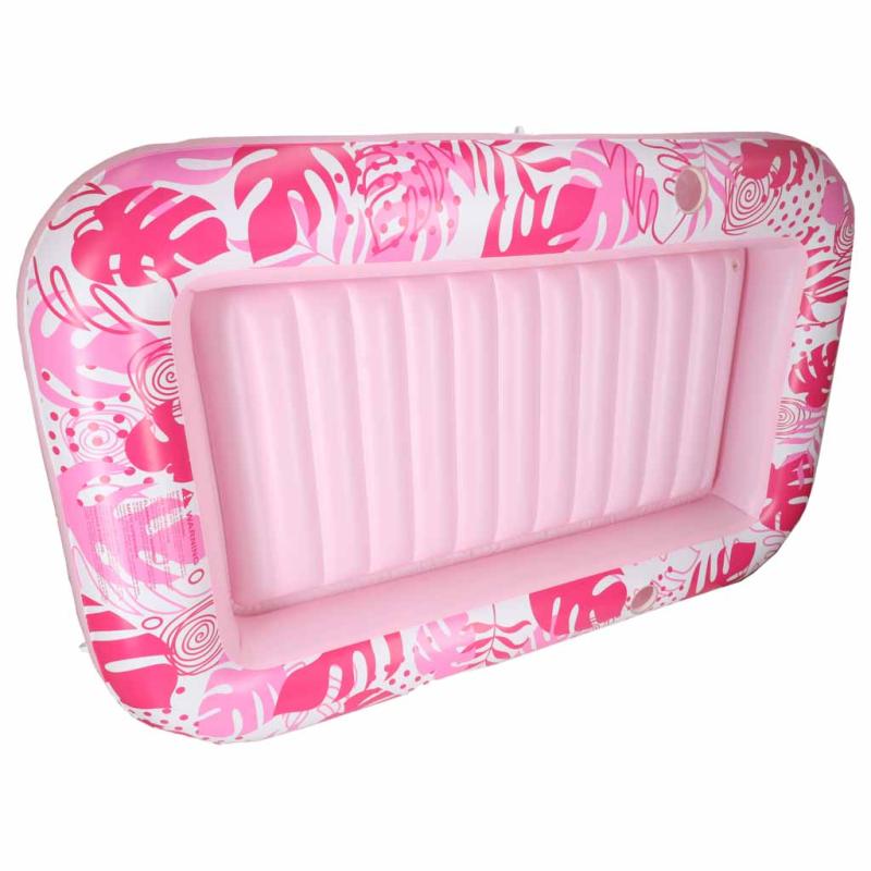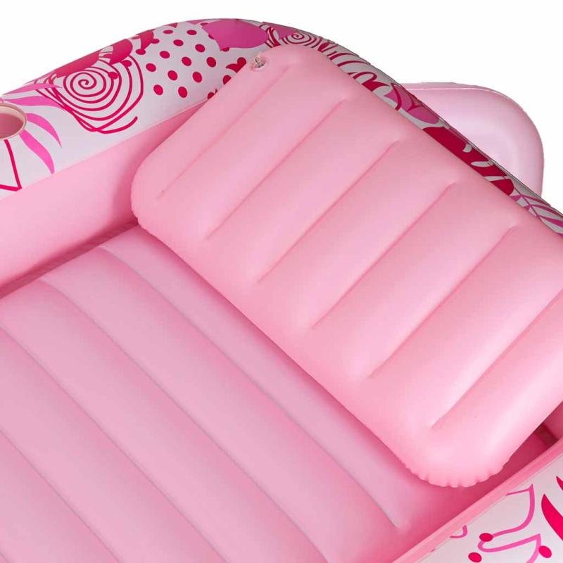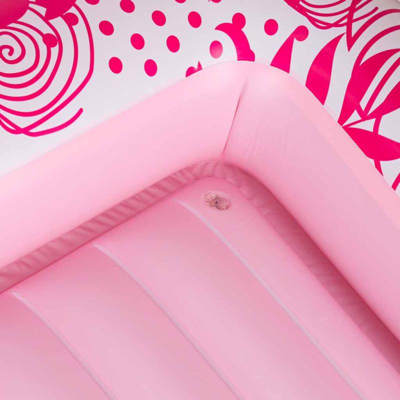 Projektując materac postawiono na uniwersalność — to coś pomiędzy luksusowym leżakiem a mobilną plażową kapsułą. Dzięki grubości materiału 0,25 mm konstrukcja zachowuje lekkość przy jednoczesnej wytrzymałości, a kolorystyka w odcieniach różu i bieli dodaje letniego charakteru każdej kąpielowej scenie.