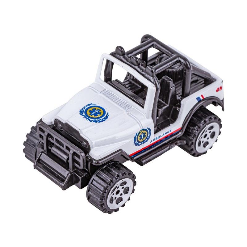 Zestaw zawiera sześć różnorodnych modeli: ciężarówkę z ruchomą drabiną, ambulans ratunkowy, jeepa, pojazd terenowy (pick-up), samochód osobowy oraz poduszkowiec — wszystkie utrzymane w przeważającym kolorze białym. Modele są zaprojektowane z naciskiem na wierne odwzorowanie kształtów znanych maszyn, dzięki czemu świetnie sprawdzą się zarówno w zabawie, jak i jako element kolekcji.