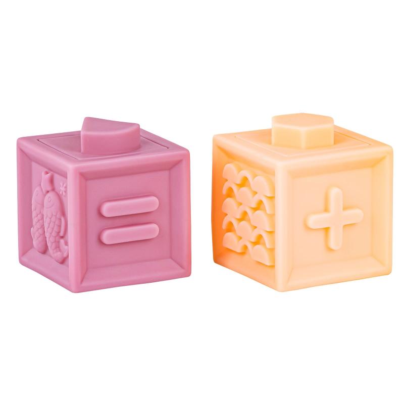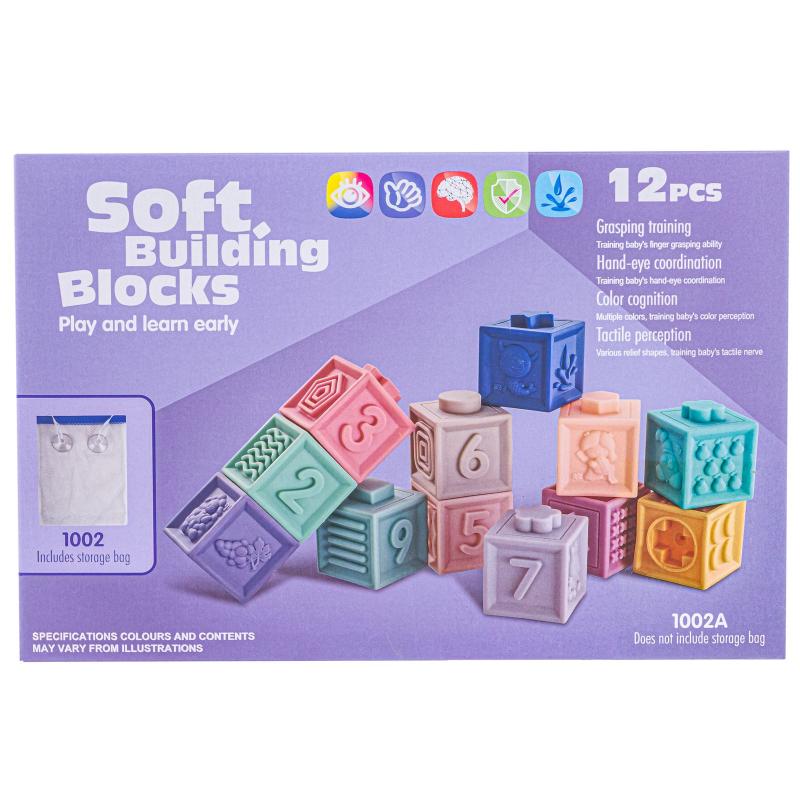 Niezwykle miękkie klocki zaciekawią każde dziecko. Klocki są gumowe i miłe w dotyku. Posiadają wypukłe elementy, dzięki czemu można je spasować w wieżę. Każdy z klocków posiada na ściankach cyferki, zwierzątka, owoce, kształty, figury geometryczne oraz znaki matematyczne. Są one odporne na wodę, dzięki czemu idealnie nadają się do zabaw podczas kąpieli. W razie potrzeby klocki można bezpiecznie wyparzać w gorącej wodzie.