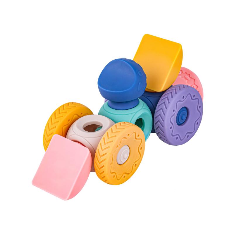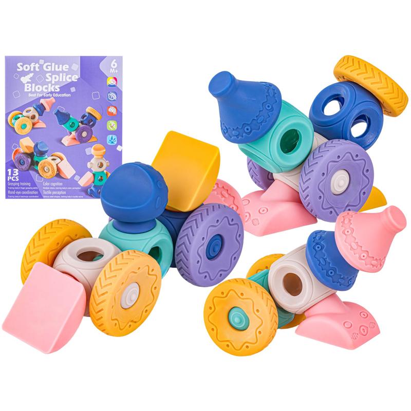Miękkie Klocki Sensoryczne 13 sztuk silikonowe dla niemowląt od 6 miesiąca życia, wodoodporne i bezpieczne do kąpieli, opakowanie 22,5 × 17,5 × 5 cm, koło Ø 6 cm. Zestaw zawiera 13 miękkich, gumowych elementów o różnych kształtach i fakturach, które można łączyć w budowle lub pojazdy na kołach; klocki są miłe w dotyku i nadają się do wyparzania. Zabawa nimi wspiera rozwój koordynacji wzrokowo-ruchowej, zdolności manualnych oraz naukę kolorów i figur. Dzięki odporności na wodę idealnie sprawdzą się podczas kąpieli, a trwały silikon gwarantuje bezpieczeństwo dla malucha.