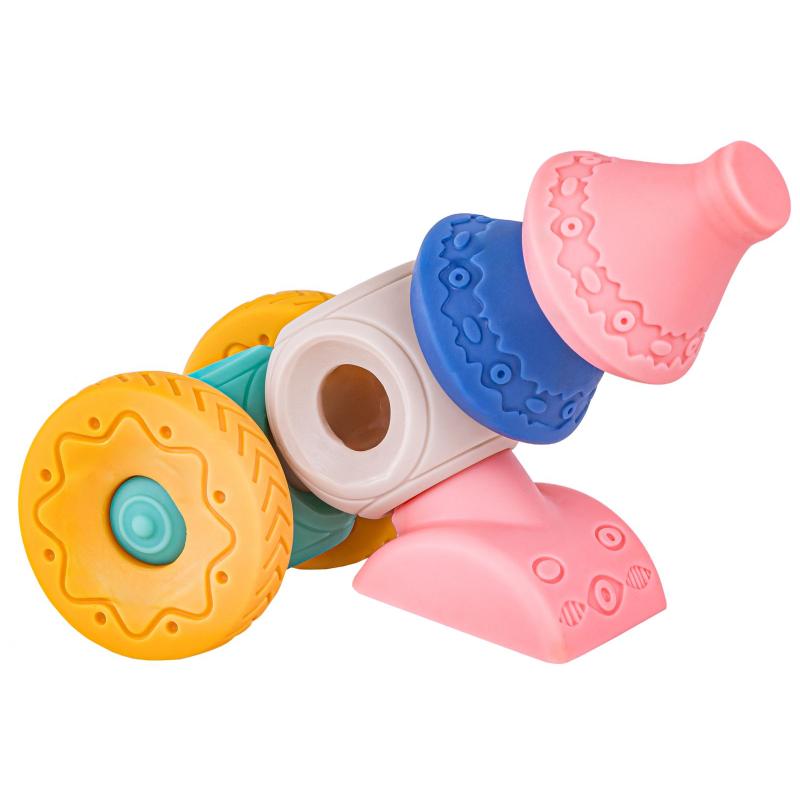 Klocki przeznaczone są dla dzieci powyżej 6 miesiąca życia i zostały zaprojektowane z myślą o najmłodszych — miękki, gumowy silikon minimalizuje ryzyko urazów, a brak ostrych krawędzi pozwala na swobodne wkładanie i potrząsanie elementami. Dzięki wodoodporności zabawka świetnie sprawdza się podczas kąpieli, a możliwość wyparzania w gorącej wodzie ułatwia utrzymanie higieny.