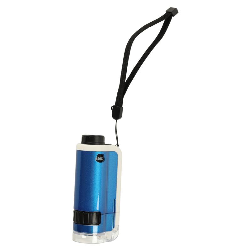 Mikroskop kieszonkowy dla dzieci oferuje dwa poziomy powiększenia 100x i 250x do obserwacji liści, włókien oraz kryształów soli. Wykonany z aluminium, ma wymiary 11,5 × 5 cm, a zasilany jest trzema bateriami AAA (brak w zestawie). W komplecie znajduje się pokrowiec ochronny oraz smycz ułatwiająca przenoszenie. Produkt dedykowany jest dla dzieci powyżej 6 lat, łącząc naukę z zabawą i rozwijając ciekawość świata przyrodniczego. Mikroskop pozwala na szczegółowe eksperymenty i jest zapakowany w kartonowe opakowanie z plastikowym okienkiem.
