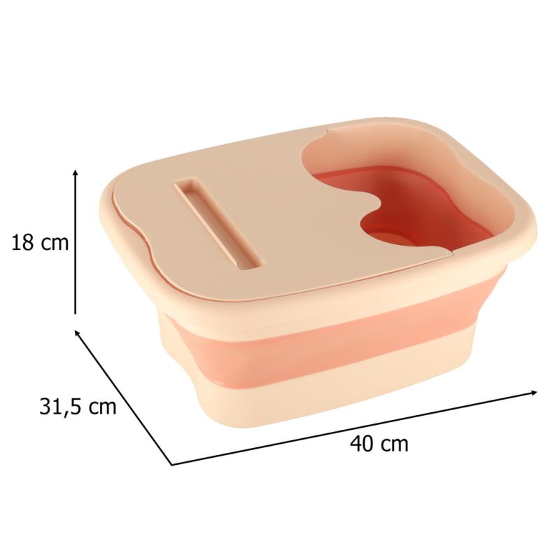 Miska do masażu mycia stóp nóg silikonowa składana wiadro z wypustkami ma pojemność 13 l, wymiary 40 × 18 × 31,5 cm oraz wagę 0,678 kg. Wykonana z plastiku miska posiada wypustki masujące dno, które poprawiają krążenie i obniżają napięcie mięśniowe. Produkt jest składany do grubości 6 cm, co ułatwia przechowywanie i transport. Wyposażona w nakładkę o wymiarach 25 × 29 cm, zapewnia komfort podczas masażu i mycia stóp. Miska przeznaczona jest do domowego relaksu i pielęgnacji stóp, m.in. podczas pedikiuru lub kąpieli stóp z dodatkami.