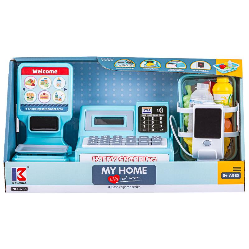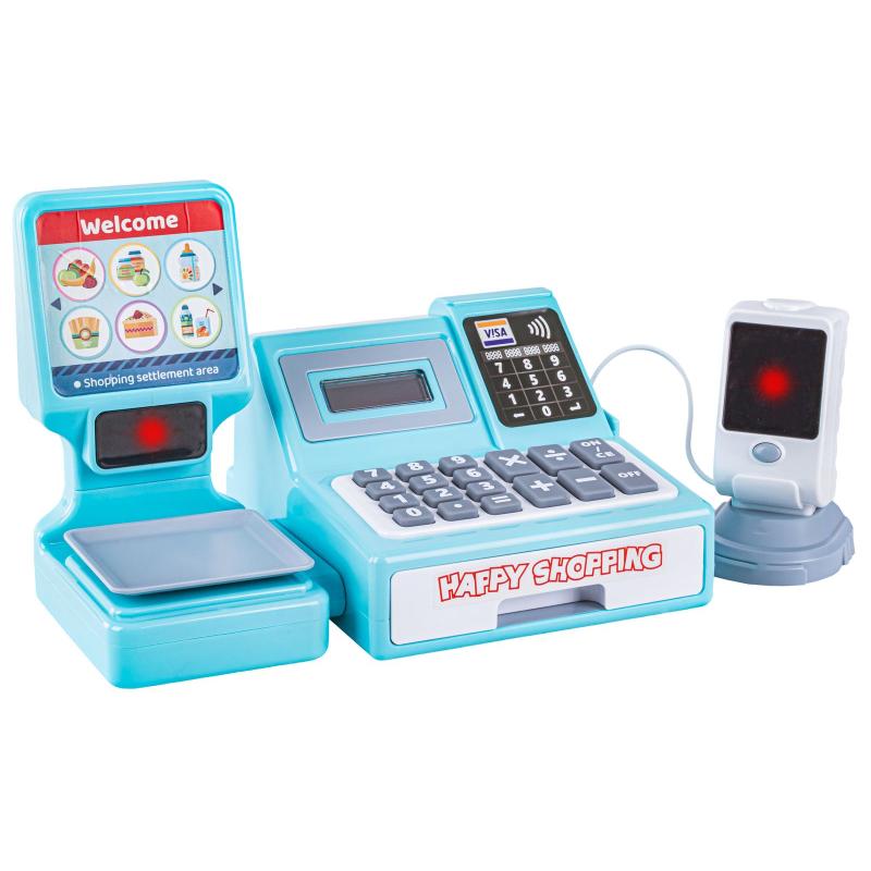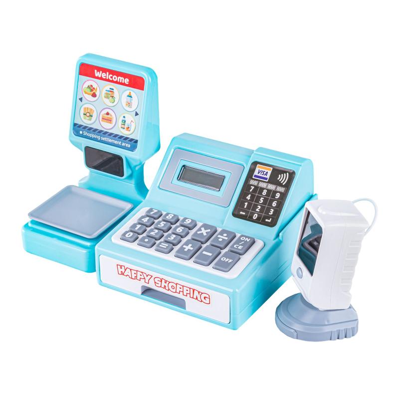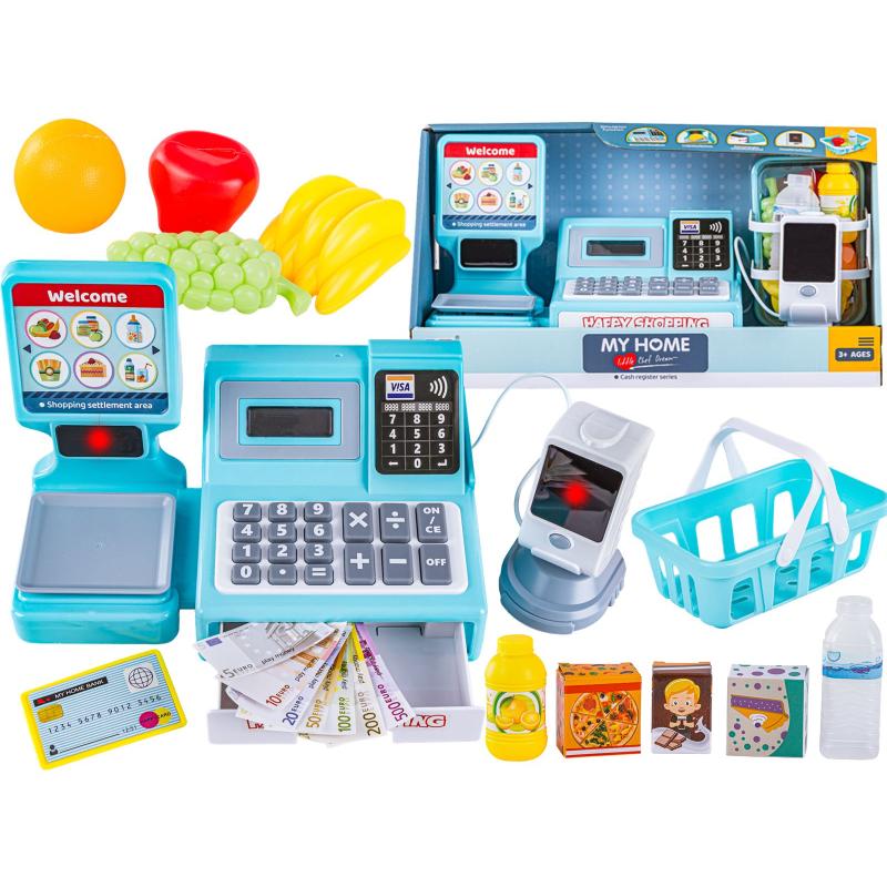 Kasa edukacyjna fiskalna - błękitna, wymiary kasy 25,5 × 17,5 × 17,5 cm, opakowanie 38,5 × 18,5 × 20 cm, czytnik ok. 7 × 7 × 12 cm. Zestaw zawiera kasę z czytnikiem kodów, wagą i kalkulatorem oraz koszyk, kartę płatniczą, owoce i banknoty, wszystko gotowe do zabawy. Duże klawisze i dźwięk skanera ułatwiają naukę obsługi sklepu, a waga sygnalizuje ważenie czerwoną diodą. Do uruchomienia kasy potrzebne są 2 × 1,5V AA (brak), waga działa na 2 × LR44 (testowe w zestawie). Idealna do zabawy i nauki liczenia oraz obsługi płatności.