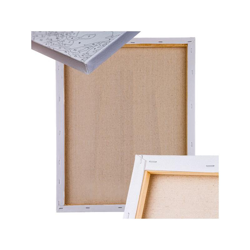 Zestaw zawiera płótno z nadrukiem naciągnięte na drewnianą ramę oraz zestaw farbek akrylowych oznaczonych numerami — każdy fragment obrazu ma przypisany kolor, co ułatwia pracę i przyspiesza efekt końcowy. W komplecie są trzy pędzelki o różnych końcówkach, dwie zawieszki ze śrubkami do powieszenia gotowego obrazu, kartka z nadrukiem całego wzoru i instrukcją w języku polskim oraz oryginalne kartonowe opakowanie.