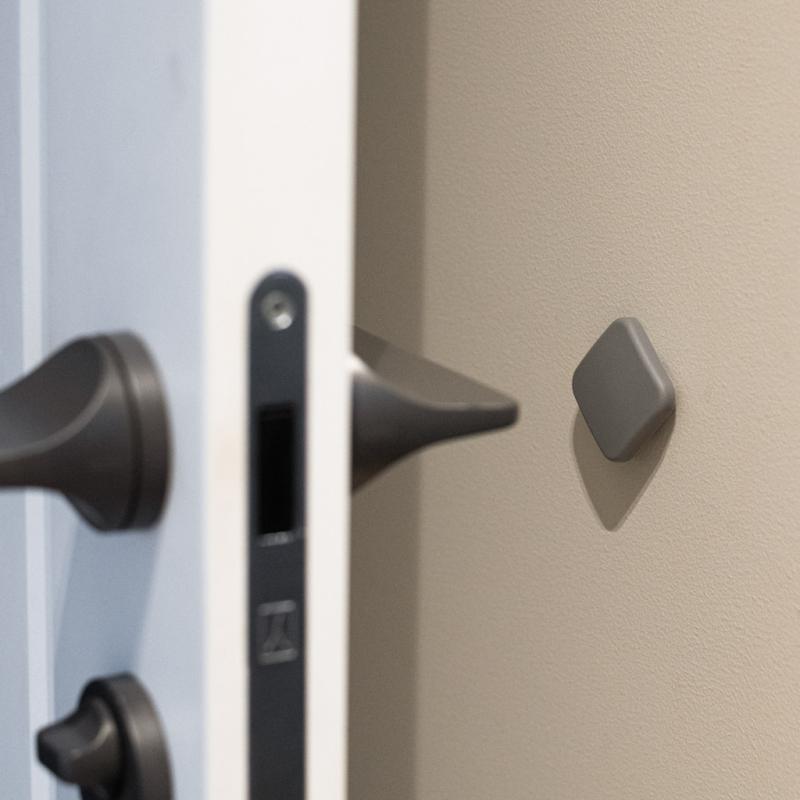Przyklej go w miejscu, w którym drzwi lub mebel najczęściej stykają się ze ścianą — na wysokości klamki lub na krawędzi mebla. Kwadratowy kształt 4 × 4 × 0,5 cm daje wystarczającą tolerancję, więc nie jest konieczne idealne wyrównanie co do milimetra.