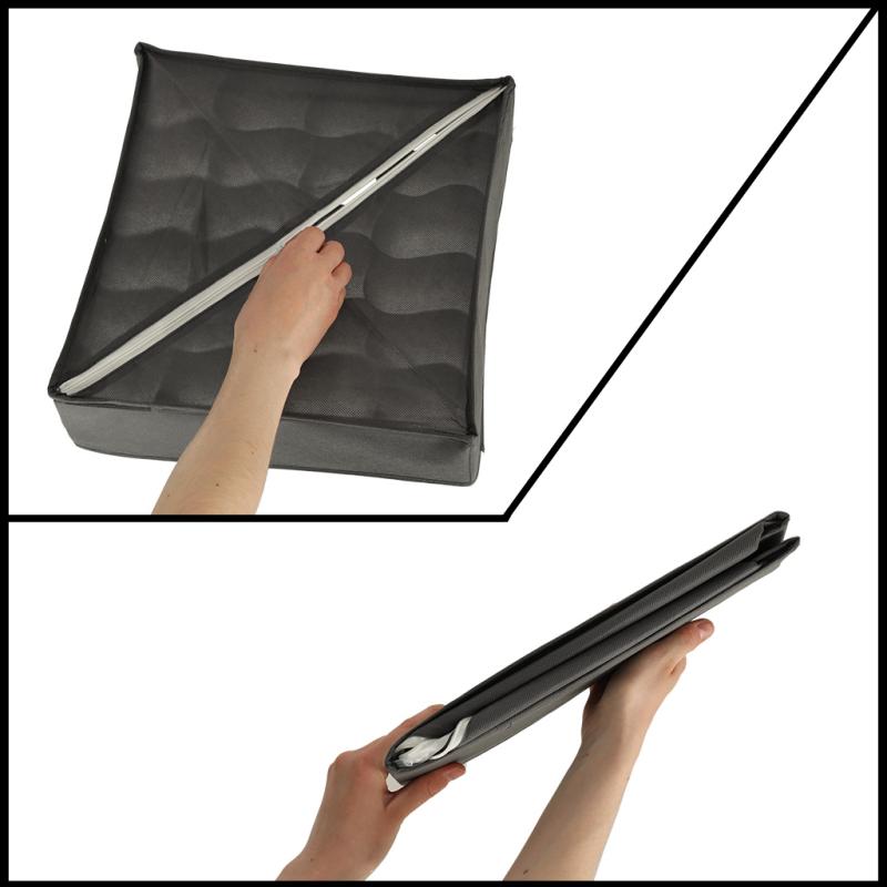 Organizer wykonano z miękkiej, ale jednocześnie wytrzymałej włókniny, która doskonale przepuszcza powietrze, chroniąc przechowywane tekstylia przed nieprzyjemnymi zapachami czy wilgocią. Materiał jest łatwy do czyszczenia, dzięki czemu utrzymanie porządku jest jeszcze prostsze. Elastyczne ścianki przegród dostosowują się do zawartości, zapewniając praktyczne i wygodne przechowywanie.