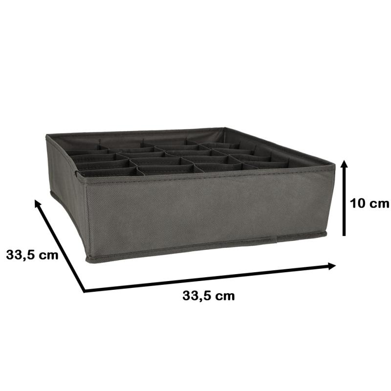 Organizer do szuflady na bieliznę z 24 przegrodami i usztywnianymi ściankami to praktyczne rozwiązanie do porządkowania skarpetek, bielizny i dodatków. Wykonany z miękkiej, przepuszczającej powietrze włókniny w szarym kolorze, łatwo się czyści i jest trwały dzięki wzmocnionym ściankom. Elastyczne przegrody dopasowują się do różnych rozmiarów przedmiotów, a kompaktowe wymiary 33,5 × 33,5 × 10 cm sprawiają, że organizer zmieści się w większości szuflad. Po złożeniu zajmuje mało miejsca, co ułatwia przechowywanie. Dzięki niemu codzienny porządek w szafie staje się łatwiejszy i bardziej funkcjonalny.