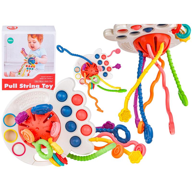 Ośmiornica sensoryczna 4w1 grzechotka-gryzak ok. 25 × 13,5 × 12 cm, opakowanie 14 × 12,5 × 7,5 cm, dla dzieci powyżej 18 miesiąca życia. Wielofunkcyjna zabawka łączy gryzak, grzechotkę i elementy sensoryczne: 6 silikonowych sznurków o różnych fakturach, 3 kolorowe kółeczka, Pop it z 7 miękkimi wypustkami, antypoślizgowy uchwyt i przesuwane guziki, co angażuje wzrok i manualnie. Wykonana z bezpiecznych, nietoksycznych materiałów, lekka i trwała. Zabawka rozwija koordynację wzrokowo-ruchową i koncentrację, a dzięki różnym zakończeniom sznurków można ją łatwo zawiesić na wózku lub w samochodzie, zabierając na spacer.