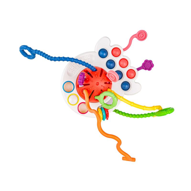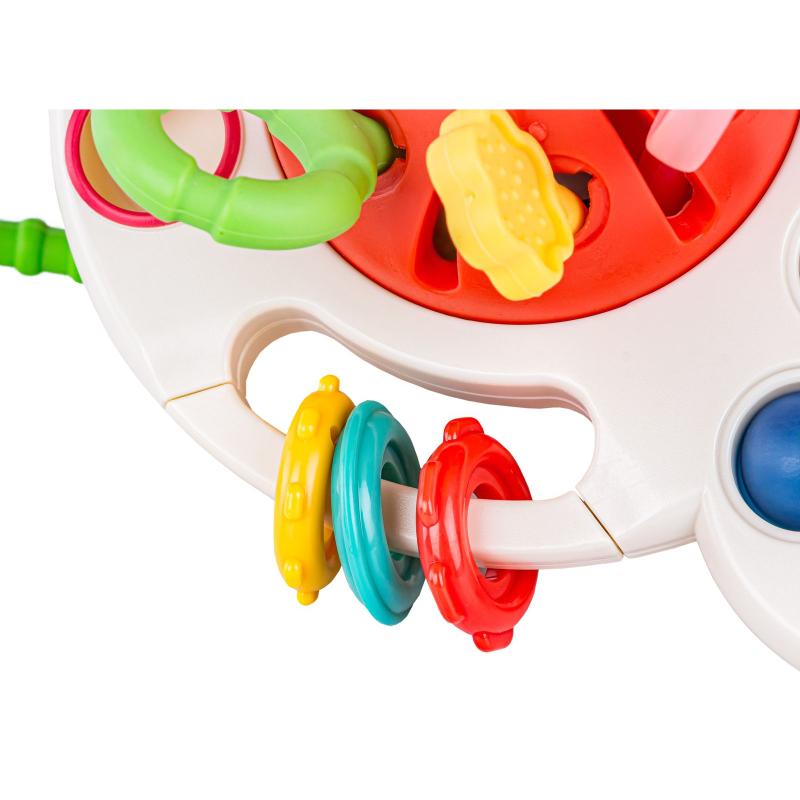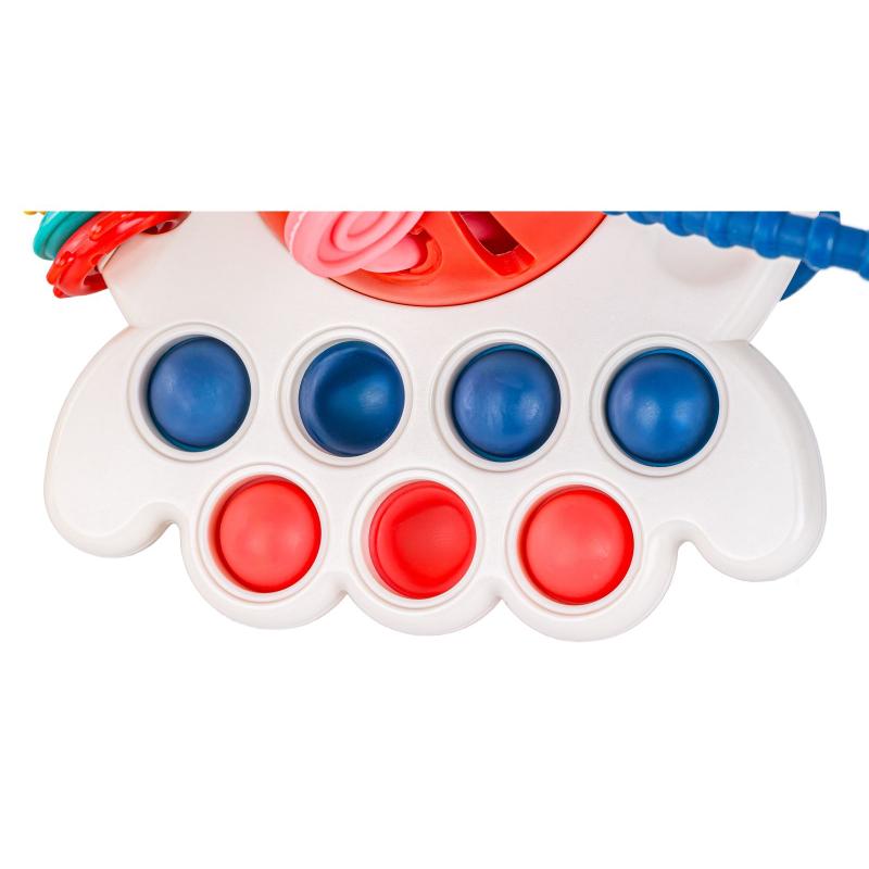 - Funkcje: gryzak, grzechotka, Pop it (7 miękkich wypustek), przesuwane guziki
