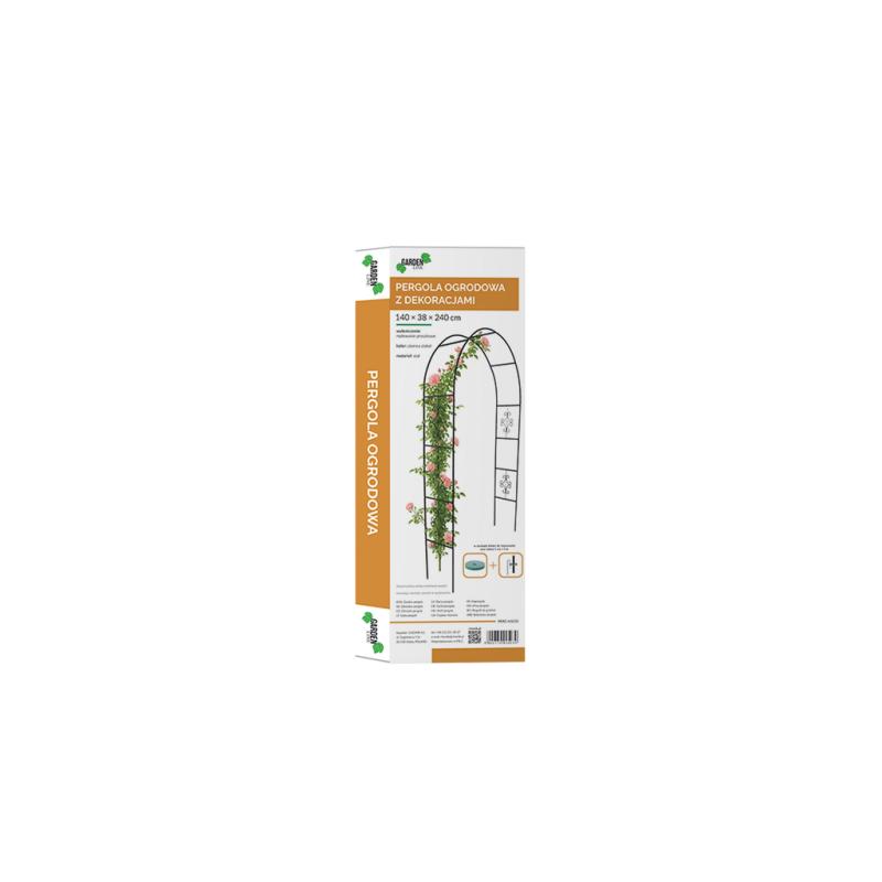 Pergola ogrodowa 240 cm z łukiem i uchwytem na róże — stal malowana proszkowo, kolor ciemna zieleń, dekoracyjne wykończenia dodające lekkości i elegancji. Konstrukcja pełni funkcję solidnej podpory dla pnączy i kwiatów oraz efektownej dekoracji ogrodu; ozdobne detale podkreślają styl miejsca. Wymiary konstrukcji to 240 × 140 × 38 cm; produkt do samodzielnego złożenia, w zestawie kotwy montażowe i taśma 1 cm × 1 m; zapakowane w karton. Dzięki stabilnej, odpornej na warunki atmosferyczne stali i kompaktowym rozmiarom świetnie sprawdzi się na tarasie i w małym ogrodzie jako romantyczna altana dla pnączy.