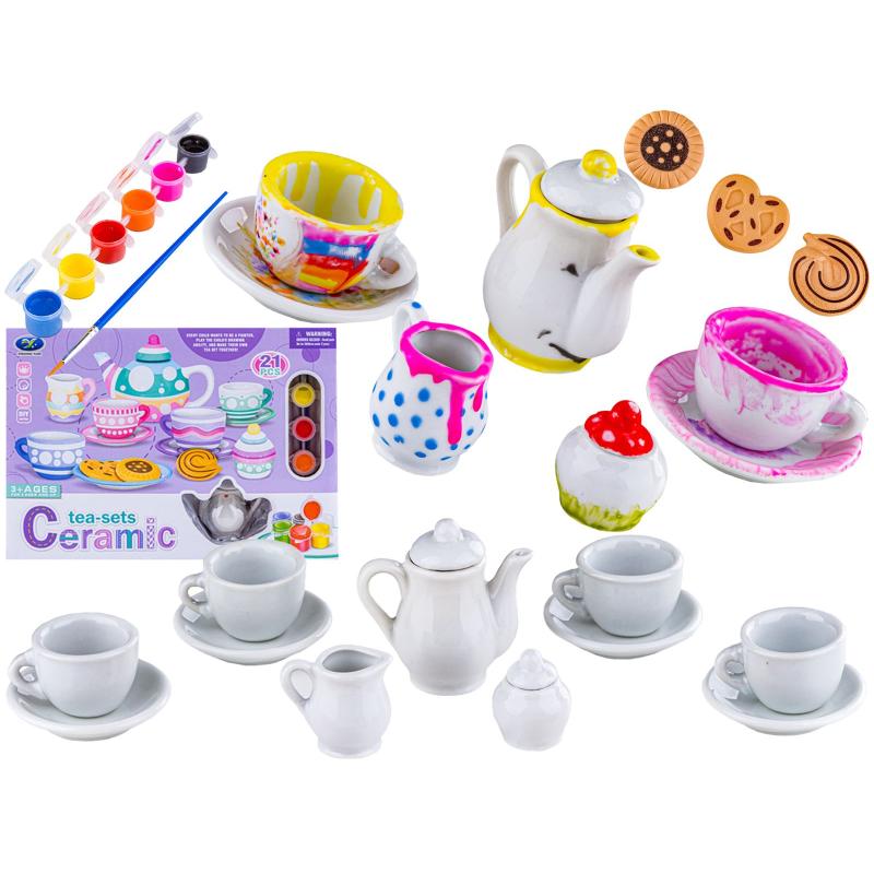 - Zawartość: 4 filiżanki, 4 talerzyki, imbryczek z przykrywką, mlecznik, cukierniczka, 3 ciasteczka, farbki (6 kolorów), pędzelek, oryginalne opakowanie