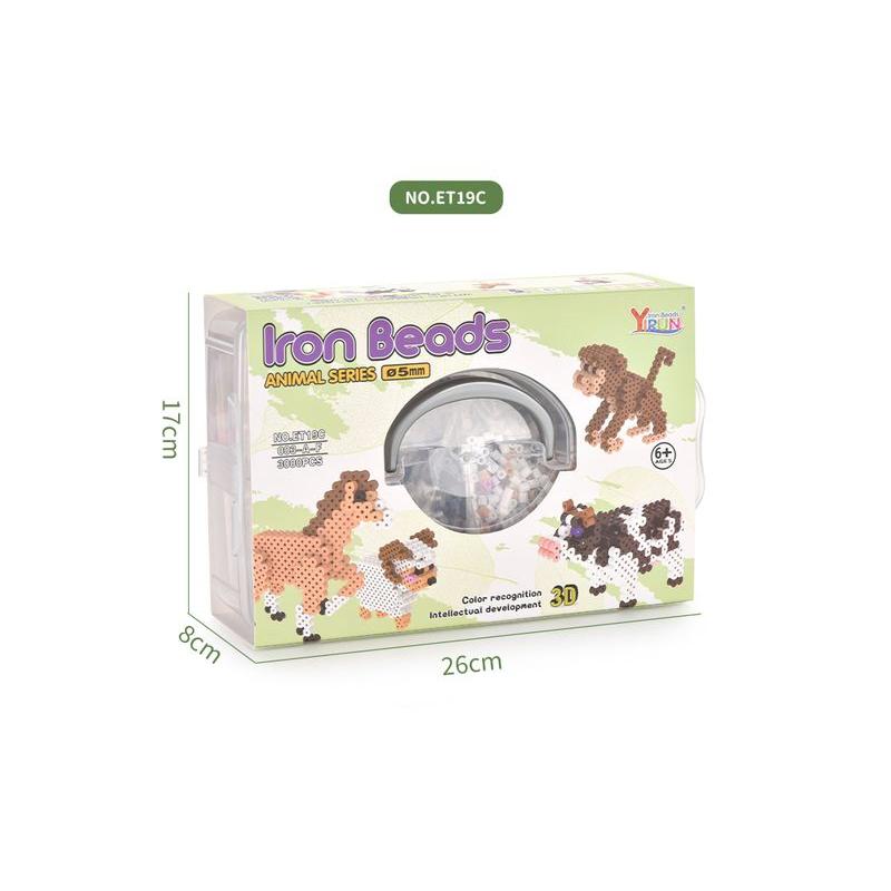 Zestaw zawiera wszystko, co potrzebne, by stworzyć sześć uroczych zwierzątek: konika, słonika, krówkę, małpkę, jelonka oraz baranka. W komplecie znajduje się kuferek z pokrywką, 6 woreczków z koralikami (po jednym woreczku na każdy wzór), podkładki do układania o wymiarach 10 × 7,5 cm, papier do prasowania, 2 pęsety oraz woreczek z białymi łącznikami i 2 czarne uchwyty do ich montażu.