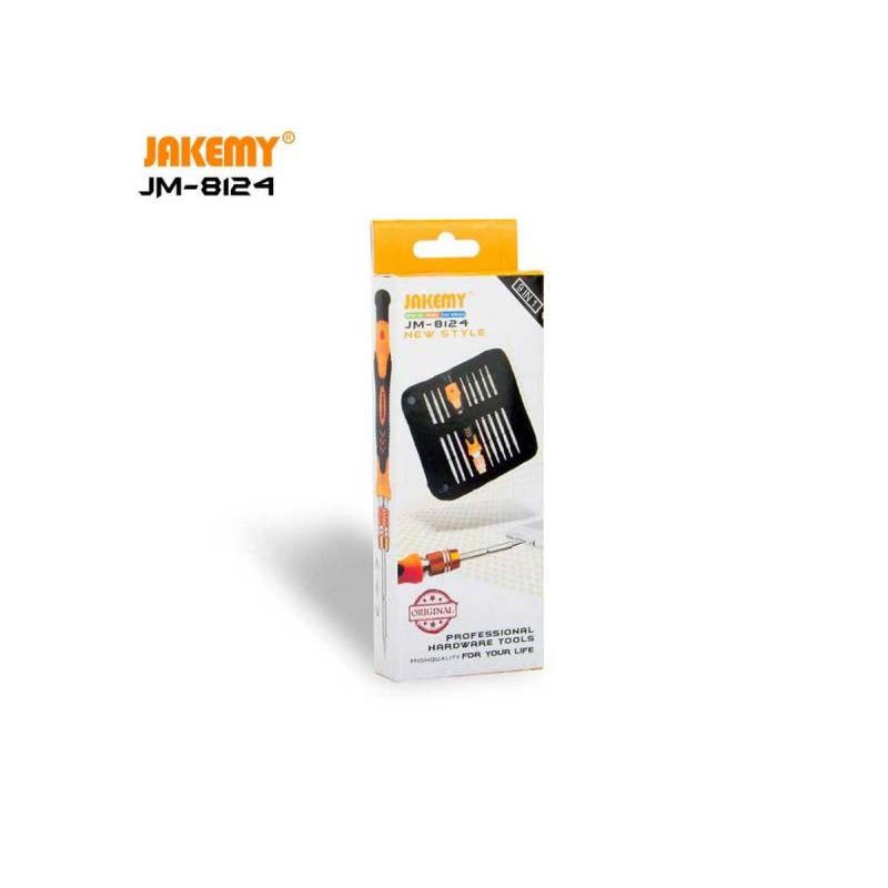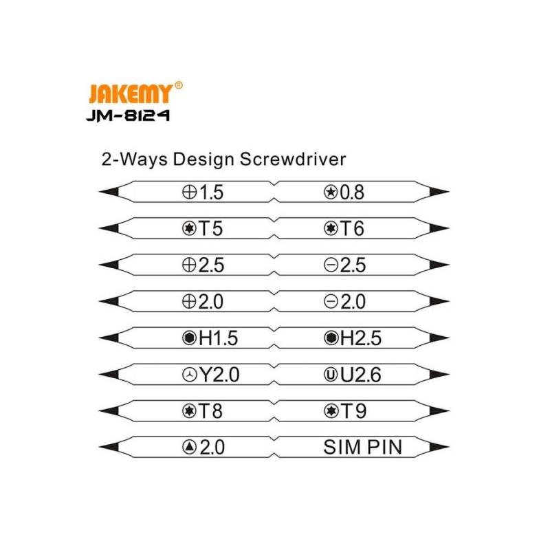 Zestaw precyzyjny JAKEMY JM-8124 9w1 to kompaktowy komplet narzędzi stworzony do wygodnej naprawy telefonów, tabletów i drobnej elektroniki — pozwala szybko dobrać odpowiednią końcówkę i bezpiecznie otworzyć nawet urządzenia z niestandardowymi śrubami.