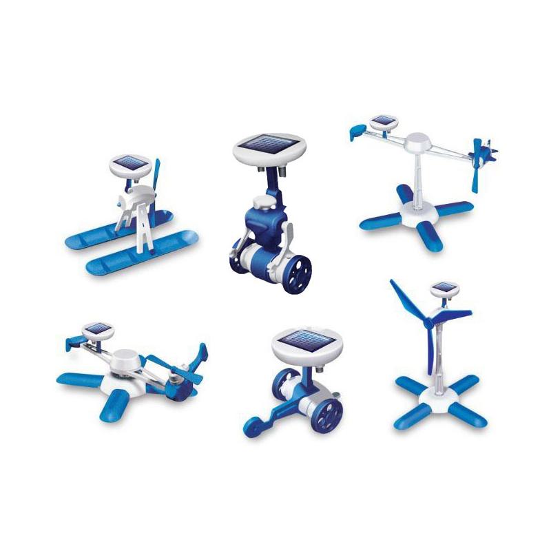 W pudełku kryje się aż sześć modeli do samodzielnego złożenia: wiatrak, helikopter, narciarz wodny, słoneczny samochodzik, robot i samolot. Wszystkie konstrukcje napędza ten sam panel solarny współpracujący z dołączonym silniczkiem, więc po ustawieniu panelu w świetle urządzenia zaczynają się poruszać bez użycia baterii.