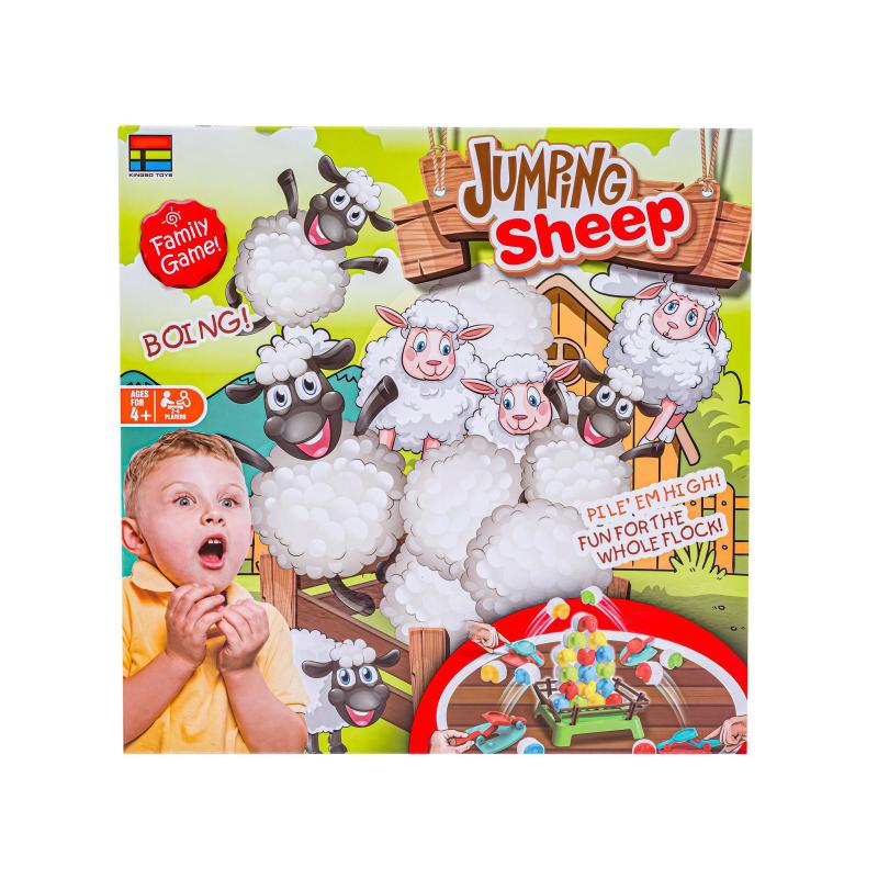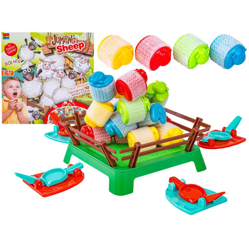 Gra zręcznościowa Jumping Sheep — skaczące owce z 4 wyrzutniami, dla 1–4 graczy, przeznaczona dla dzieci powyżej 4 roku życia, w opakowaniu 26,5 × 26,5 × 5,5 cm. Zabawa polega na trafianiu owieczek do zagrody przy pomocy wyrzutni; proste zasady i rzepy zamiast wełny umożliwiają budowanie barankowej wieży. Zestaw zawiera elementy zagrody, 4 wyrzutnie oraz po 4 owieczki w kolorach zielonym, żółtym, czerwonym i niebieskim; wymiary zagrody 16,4 × 16,4 cm × 7 cm, owieczki ok. 4,5 × 4 × 3 cm. Produkt rozwija zdolności manualne i refleks, to świetna gra rodzinna na spotkania i naukę koordynacji.