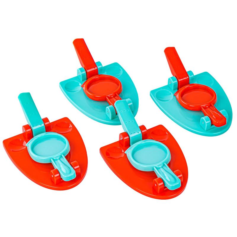Wystarczy ustawić podstawę zagrody na płaskiej powierzchni stołu lub podłogi — jej wymiary to 16,4 × 16,4 × 7 cm, więc nie zajmuje dużo miejsca. Upewnij się, że wokół jest trochę wolnej przestrzeni dla wyrzutni i by nikt nie blokował toru rzutu.