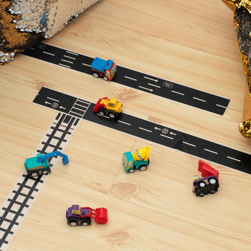 Zestaw obejmuje: betoniarkę, walec, dwie wywrotki, koparkę oraz spychacz. Tak dobór zapewnia różnorodność doświadczeń i pozwala na odgrywanie scenek rodem z placu budowy. Każde autko ma kompaktowe rozmiary 5 cm x 4 cm x 3 cm, co sprzyja zabawie zarówno w domu, jak i podróży – zmieszczą się w kieszeni lub małej torbie.