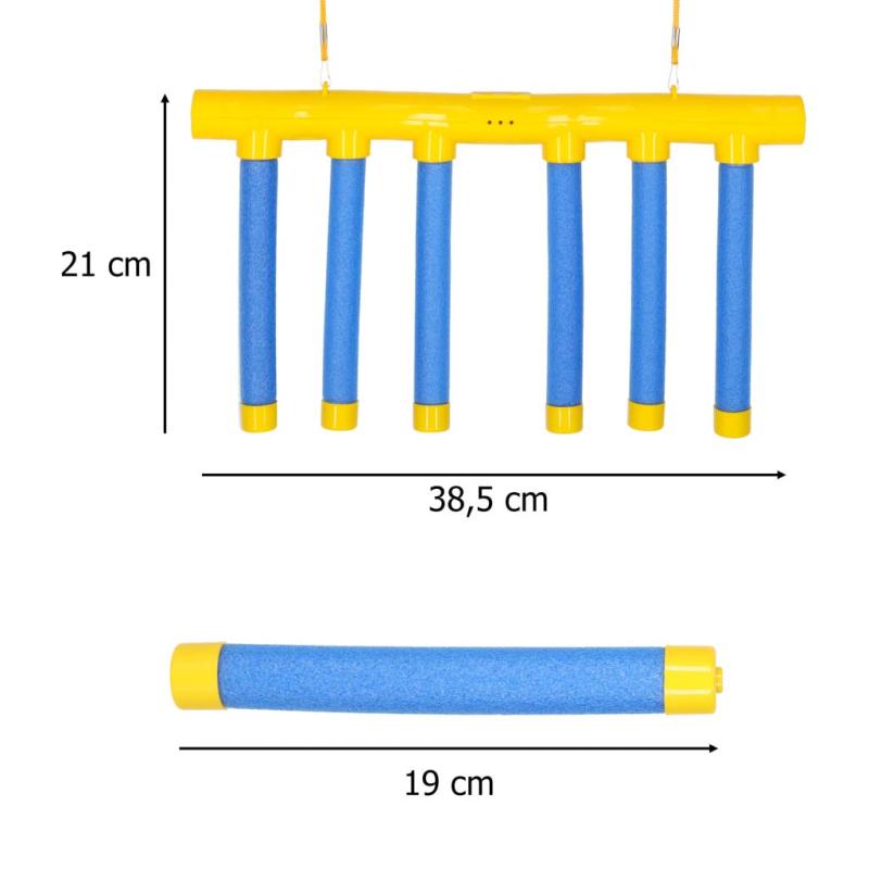 - Wymiary całkowite: 38,5 cm szerokości i 21 cm wysokości (drążek z pałeczkami).