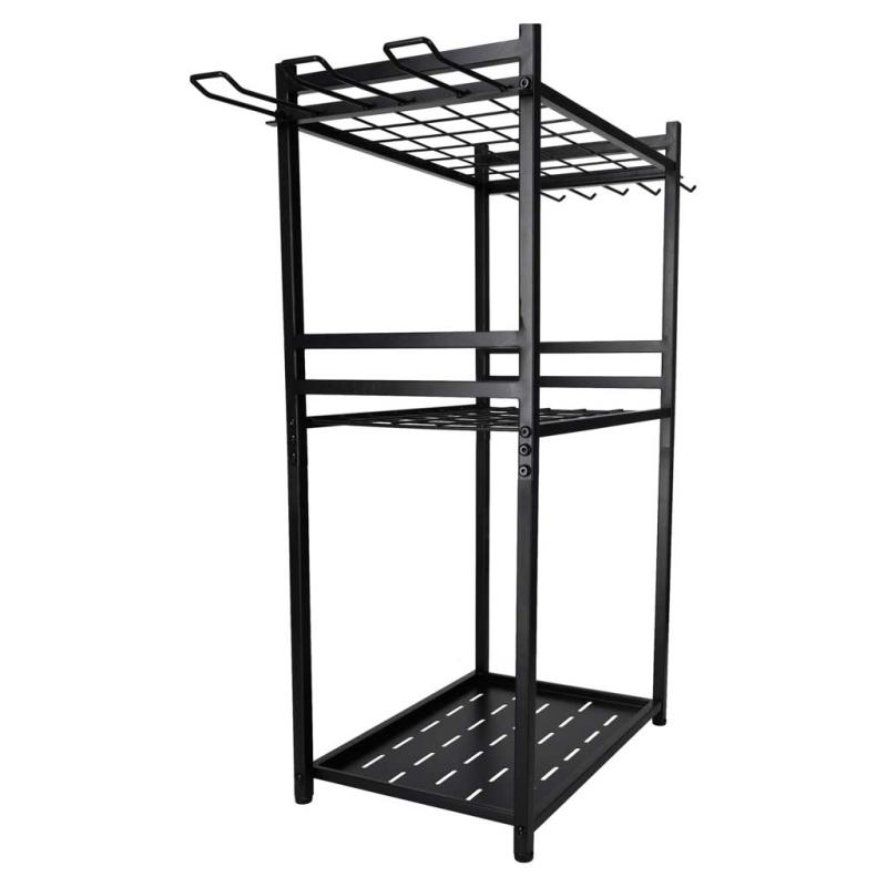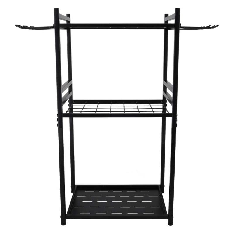 Stojak oferuje trzy poziomy półek o różnych wewnętrznych wymiarach (27 × 37,5 cm oraz 29,5 × 39,5 cm) i boczne wieszaki o długości 14 cm, co pozwala przechowywać jednocześnie kilka długich narzędzi oraz akcesoria ręczne. Najlepiej ustawić cięższe i dłuższe narzędzia na dolnej półce, a lżejsze na wyższych poziomach i bocznych wieszakach.