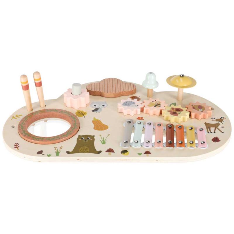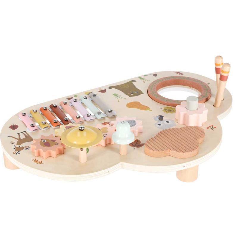 W skład stolika wchodzą cymbałki, bębenek z membraną, talerzyk, dzwonek, zębatki, karbowana chmurka oraz piszczałka. Każdy z tych elementów pełni ważną rolę w rozwoju słuchu, koordynacji oraz zdolności manualnych dziecka. Dzięki temu maluch poznaje podstawy muzyki i uczy się wyrażania emocji za pomocą dźwięku.