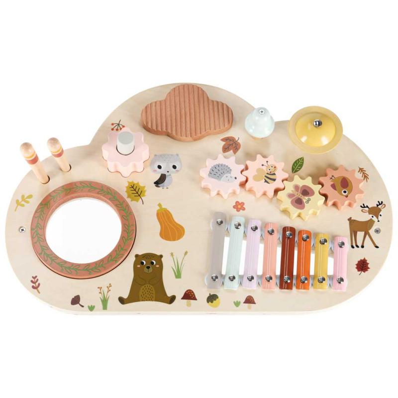 Podczas wspólnej zabawy z rodziną stolik muzyczny pozwala na tworzenie pierwszych prostych melodii i poznawanie podstaw rytmu. Zębatki uczą dzieci związku przyczynowo-skutkowego, a manipulacja karbowaną chmurką i używanie piszczałki rozwijają zdolności manualne i zachęcają do eksperymentowania z dźwiękiem.