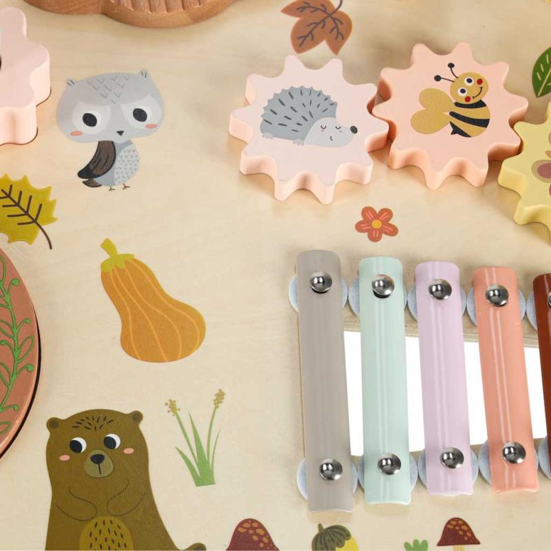 Stolik edukacyjny drewniany tablica muzyczna cymbałki talerze