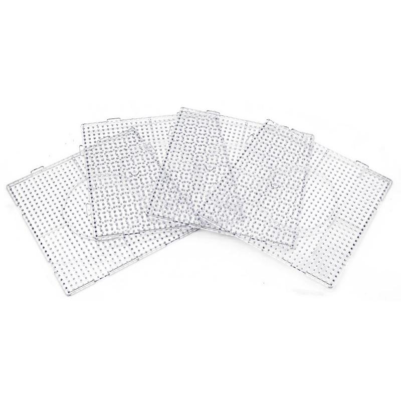 Każda podstawka ma kształt kwadratu z praktycznymi zaczepami, które umożliwiają łączenie elementów ze sobą tak, by stworzyć jedną, większą powierzchnię. Połączenie kilku kwadratów daje stabilne pole pracy, co ułatwia tworzenie obszerniejszych wzorów z koralików do prasowania. Materiał i kształt podkładki są dopasowane do standardowych zestawów prasowanek, dzięki czemu współpracują z popularnymi koralikami dostępnymi na rynku.
