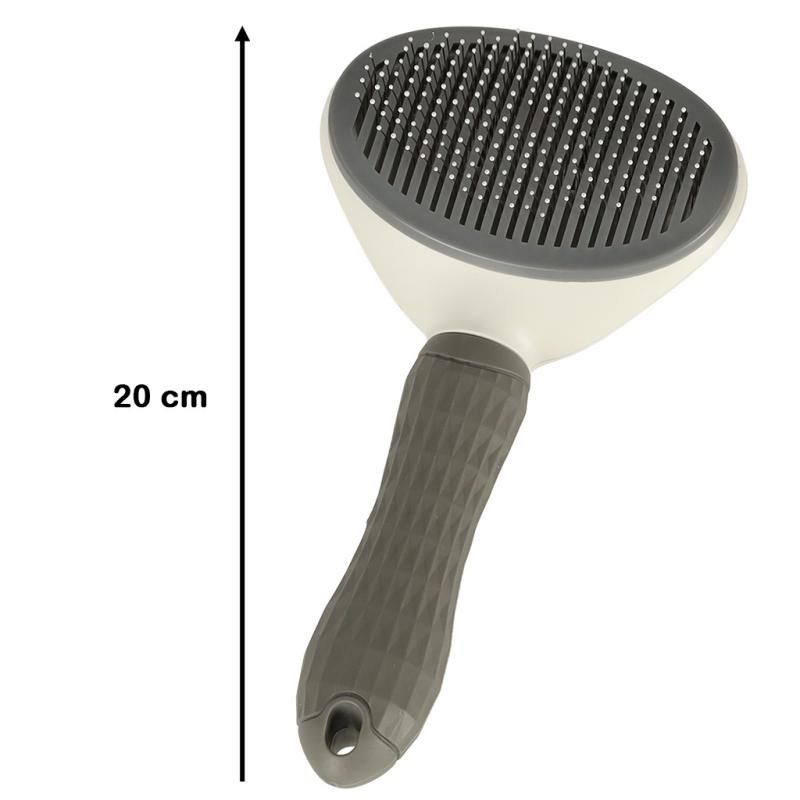 Szczotka samoczyszcząca do sierści psa i kota z mechanizmem samooczyszczenia, giętkimi ząbkami z okrągłym zakończeniem oraz ergonomiczną rączką o długości 11,5 cm. Urządzenie wykonane z trwałego plastiku, przeznaczone do zwierząt o różnej długości sierści, zapewnia delikatny masaż skóry. Po naciśnięciu przycisku sierść łatwo odchodzi od szczotki, co ułatwia utrzymanie czystości. Długość całej szczotki to 20 × 11 × 5,5 cm, a opakowanie ma wymiary 24 × 16 × 6 cm. Produkt wspomaga regularną pielęgnację, minimalizując ilość luźnej sierści w domu i poprawiając kondycję sierści pupila.