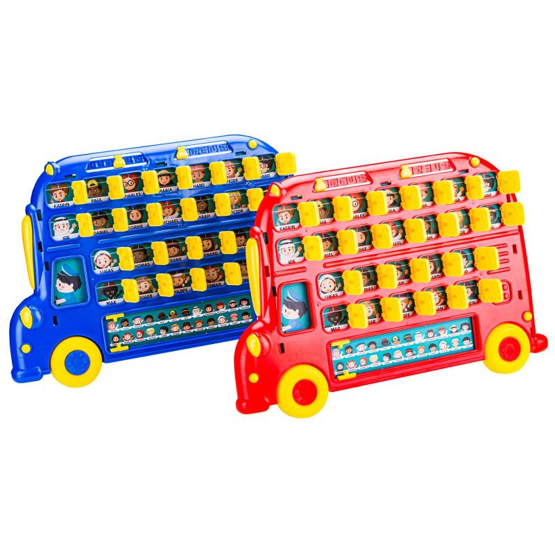 Tablica Edukacyjna AUTOBUS — 2 tablice (czerwona i niebieska) z wymiarami złożonej tablicy 33 × 22 × 9,5 cm i planszą 25 × 18 cm. Gra pamięciowa uczy koncentracji i logicznego myślenia poprzez zadawanie pytań i eliminowanie postaci; duża liczba kombinacji oraz dwustronne plansze zapewniają długą zabawę. W zestawie są 2 tablice w kształcie autobusu, 2 dwustronne plansze do każdego autobusu oraz oryginalne opakowanie o wymiarach 33,5 × 22,2 × 8 cm. Idealna do gry naprzeciwko siebie — rozwija umiejętność zadawania pytań i świetnie sprawdza się jako rozrywka dla dzieci i rodzin.