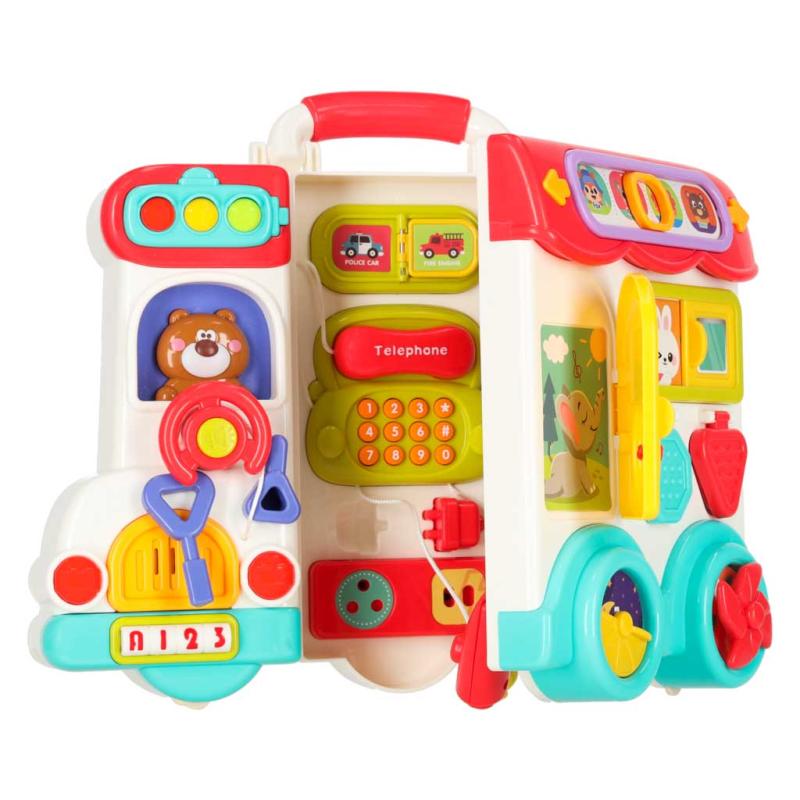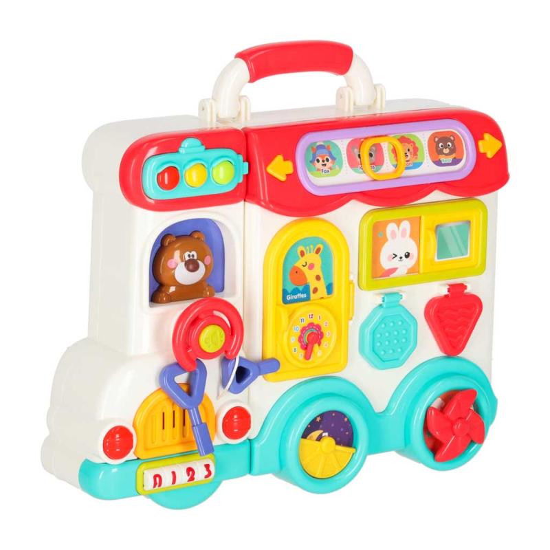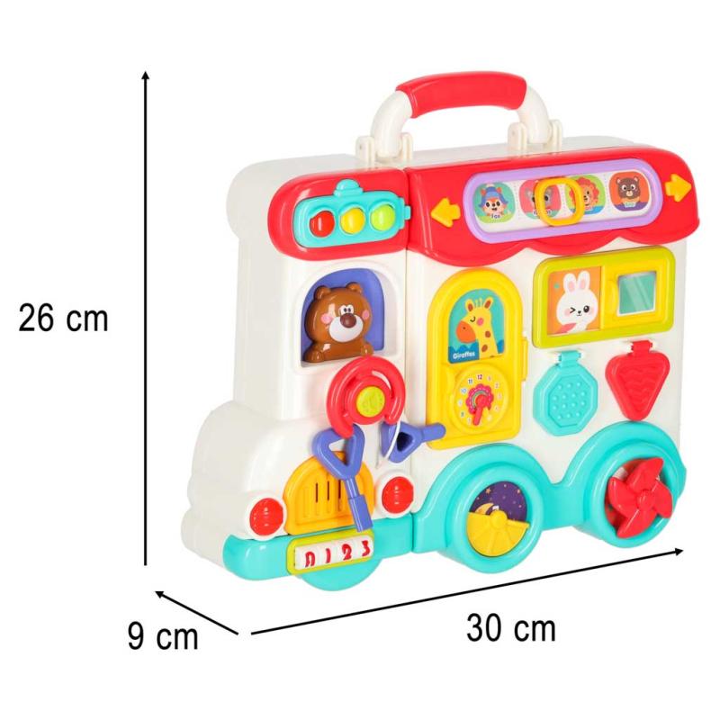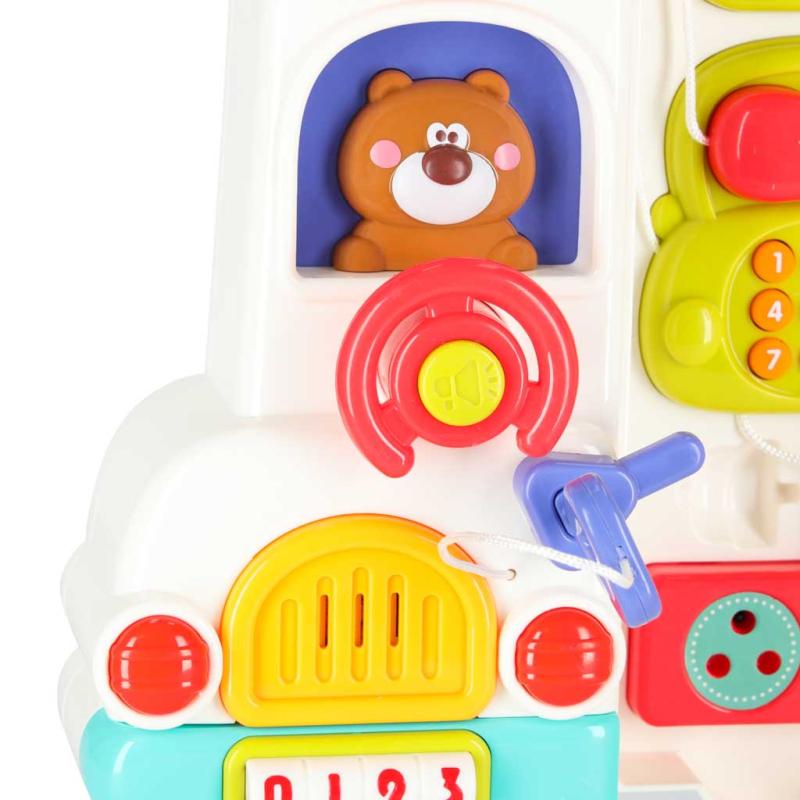 Zabawka wykonana jest z solidnego tworzywa sztucznego ABS i PS, co zapewnia trwałość i bezpieczeństwo podczas użytkowania. Konstrukcja tablicy w formie pojazdu o wymiarach 30 x 24 x 9 cm po złożeniu pozwala na łatwe przenoszenie i przechowywanie. Kolorystyka w odcieniach bieli, żółci, czerwieni, pomarańczy, zieleni i niebieskiego nadaje jej atrakcyjny, przyjazny wygląd, który szybko przyciąga uwagę malucha.