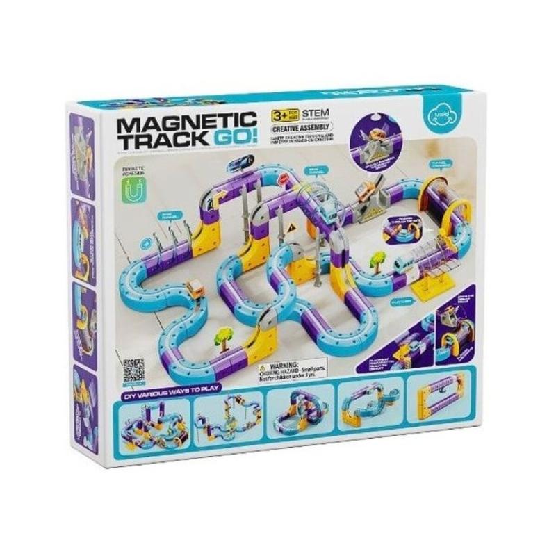 Tor magnetyczny Zjazd 128 el. — kolorowy zestaw konstrukcyjny z 128 elementami i opakowaniem 36,5 × 30 × 8,5 cm, gotowy do szybkiego montażu. Klocki łączą się na wcisk dzięki wbudowanym magnesom, pozwalając budować tory, tunele i dworce; pociągi jeżdżą także w odwróconej pozycji, co wzmacnia zabawę i wyobraźnię. Zestaw zawiera dwa pociągi, podpory, plastikowy tunel, znaki, szlaban i instrukcję obrazkową; najmniejszy kwadratowy klocek ma 4,2 × 3,5 × 3,5 cm, pociąg 4,5 × 2,7 × 3,4 cm, a ładowanie pociągu odbywa się przewodem USB. Idealny do nauki konstrukcji, kreatywnego myślenia i ćwiczenia zdolności manualnych.