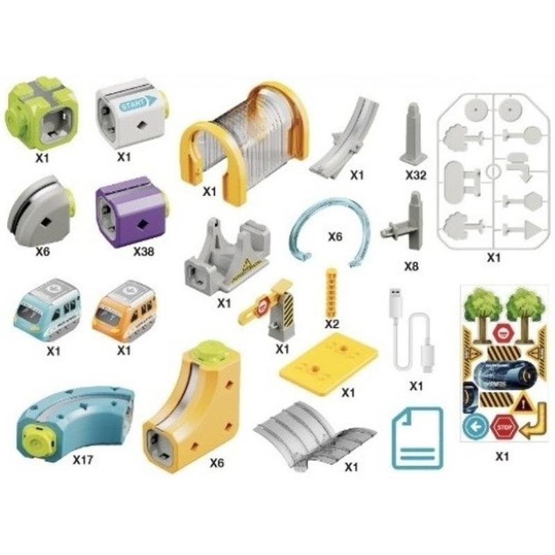 W pudełku znajdziesz 128 elementów: różnorodne klocki magnetyczne w rozmaitych kształtach, wsporniki, plastikowy tunel, mini dworzec, znaki, szlaban oraz dodatkowe akcesoria i naklejki. W komplecie są też dwa pociągi — jeden niebieski i jeden pomarańczowy — które poruszają się po torze i wzbogacają zabawę o dynamiczny element. Całość zapakowana jest w oryginalne opakowanie i zawiera przewód ładowania USB do zasilania pociągów.