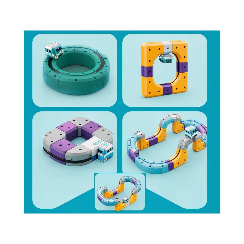 Zestaw Tor magnetyczny T942A 39 el. składa się z kolorowych elementów, które łączą się dzięki wbudowanym magnesom, co ułatwia szybki montaż i demontaż bez dodatkowych narzędzi. Dzięki magnetycznym połączeniom można budować zarówno proste odcinki, jak i bardziej złożone układy, a pociąg porusza się po torze nawet przy odwróconych fragmentach, co dodaje zabawie dynamiki i zaskoczenia. Instrukcja obrazkowa w zestawie pokazuje przykładowe układy, a kolejne zestawy z tej serii można łączyć, tworząc większe konstrukcje.