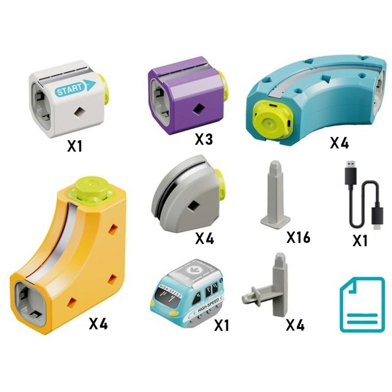 W opakowaniu znajdują się klocki magnetyczne w różnych kształtach, wsporniki do klocków, 1 pociąg oraz przewód ładowania USB, a całość zapakowana jest w oryginalne opakowanie. Pociąg zasilany jest akumulatorem ładowanym przez przewód USB — przed ładowaniem należy upewnić się, że wyłącznik pociągu wskazuje OFF.