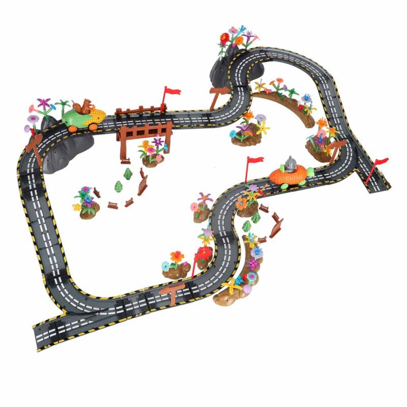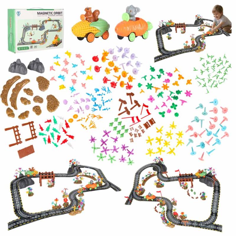 Ten zestaw pozwala zaprojektować tor zgodnie z własną wyobraźnią: 310 elementów magnetycznych łączy się szybko i stabilnie, a dodatkowe 35 łączników wzmacnia konstrukcję od spodu, dzięki czemu trasa zachowuje formę nawet przy intensywnej jeździe. W komplecie są 30 segmentów toru, składany mostek oraz 2 szlabany, które wprowadzają elementy taktyki i zabawy zespołowej. Elementy dekoracyjne — w tym 168 kwiatów z łodygami, 4 drzewka, 2 głazy i 10 nasypów ziemi — pozwalają stworzyć realistyczne otoczenie toru, a ogrodzenia i oznaczenia (8 płotków, 2 furtki, 4 flagi, 4 strzałki kierunku) ułatwiają organizację wyścigów.