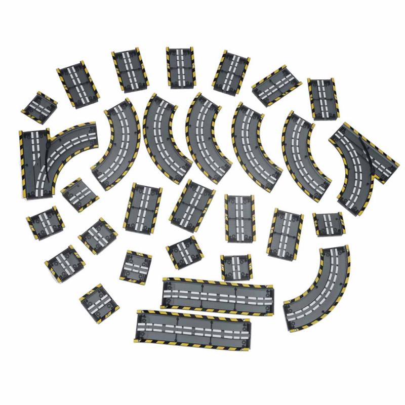 Elementy wykonano z trwałego tworzywa ABS z wtopionymi magnesami, co zapewnia stabilne i bezpieczne łączenia; montaż jest intuicyjny, a dodatkowe 35 łączników od spodu wzmacnia konstrukcję, zmniejszając ryzyko rozsypania toru podczas zabawy.