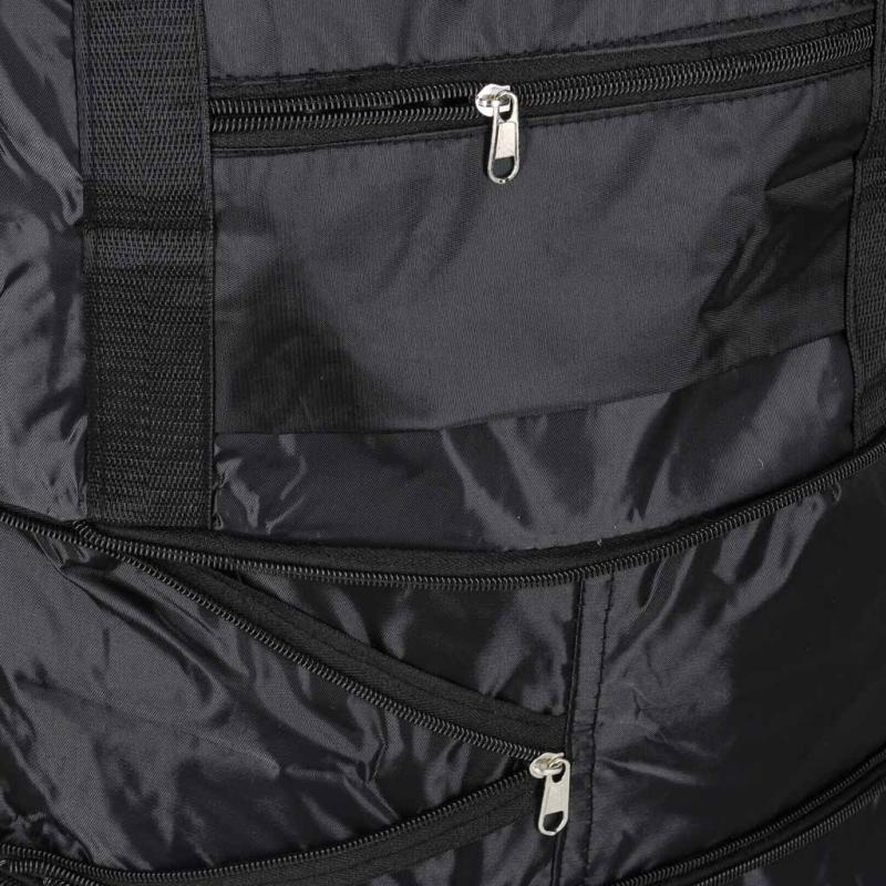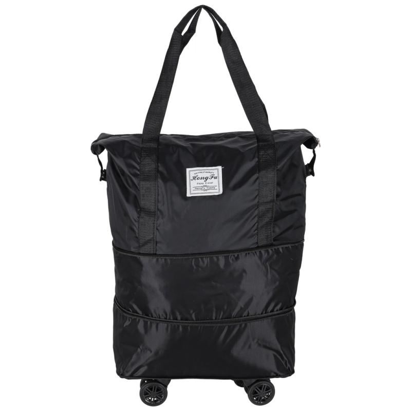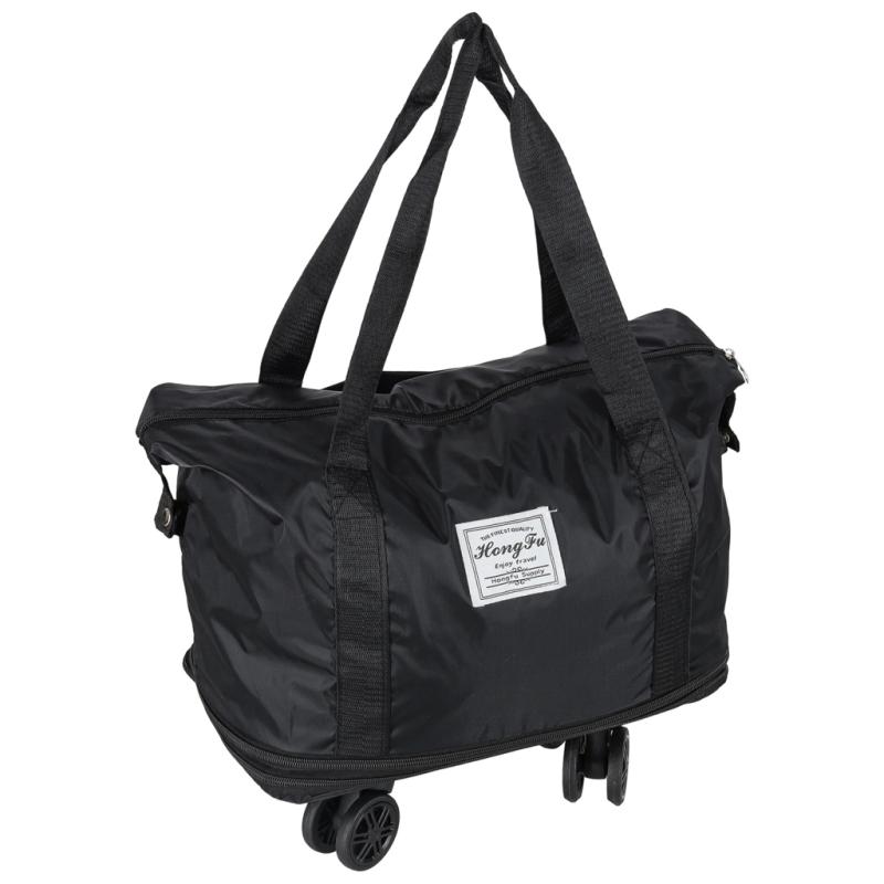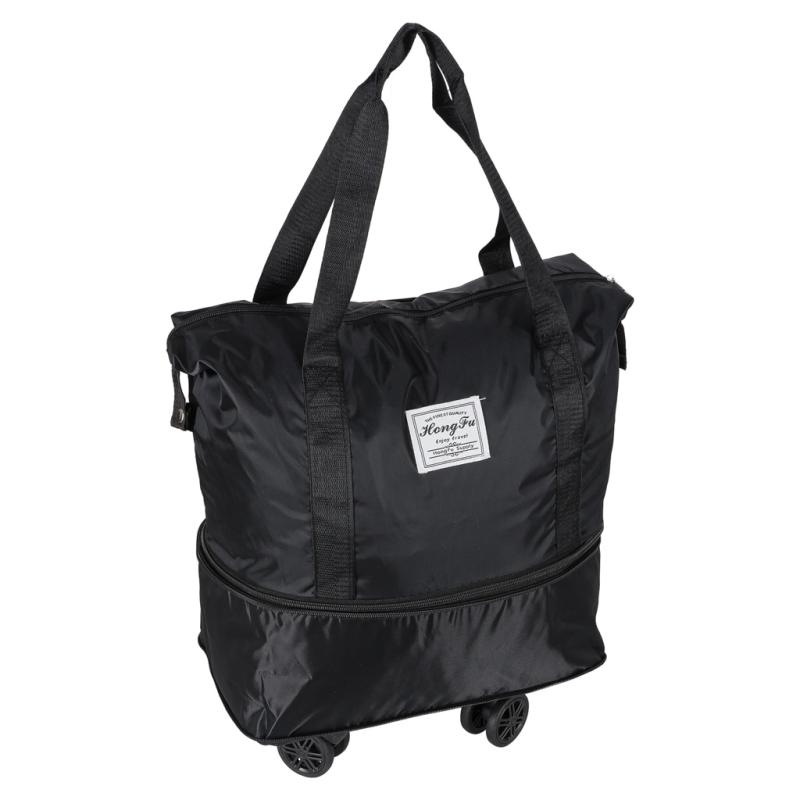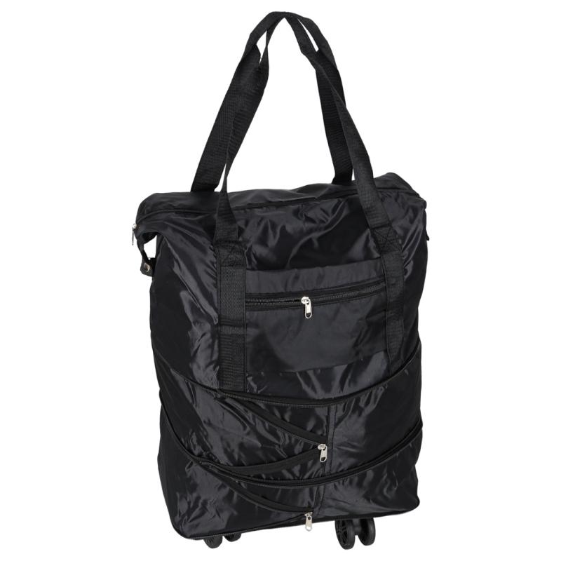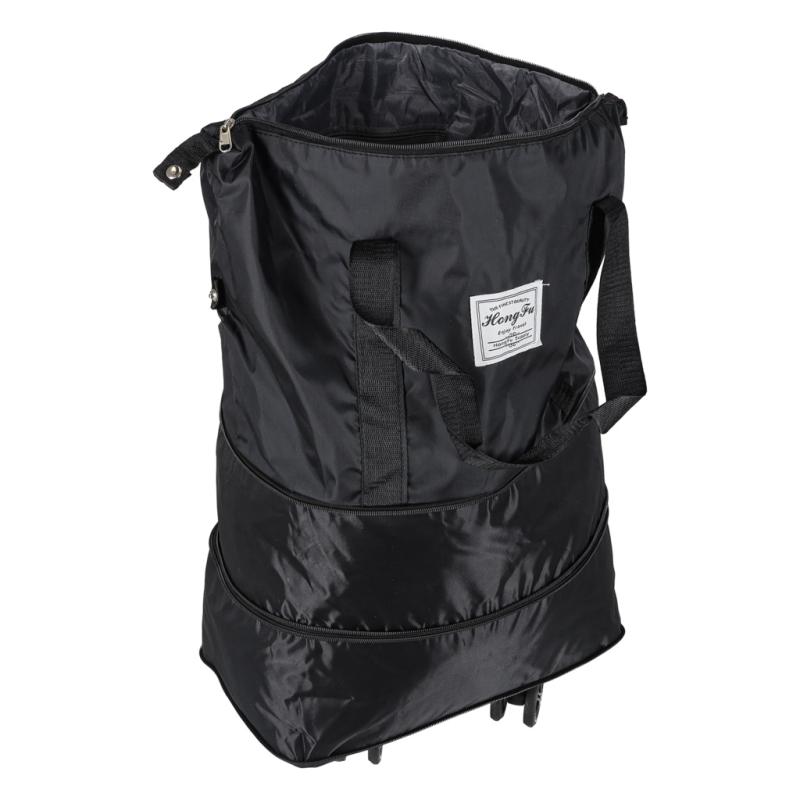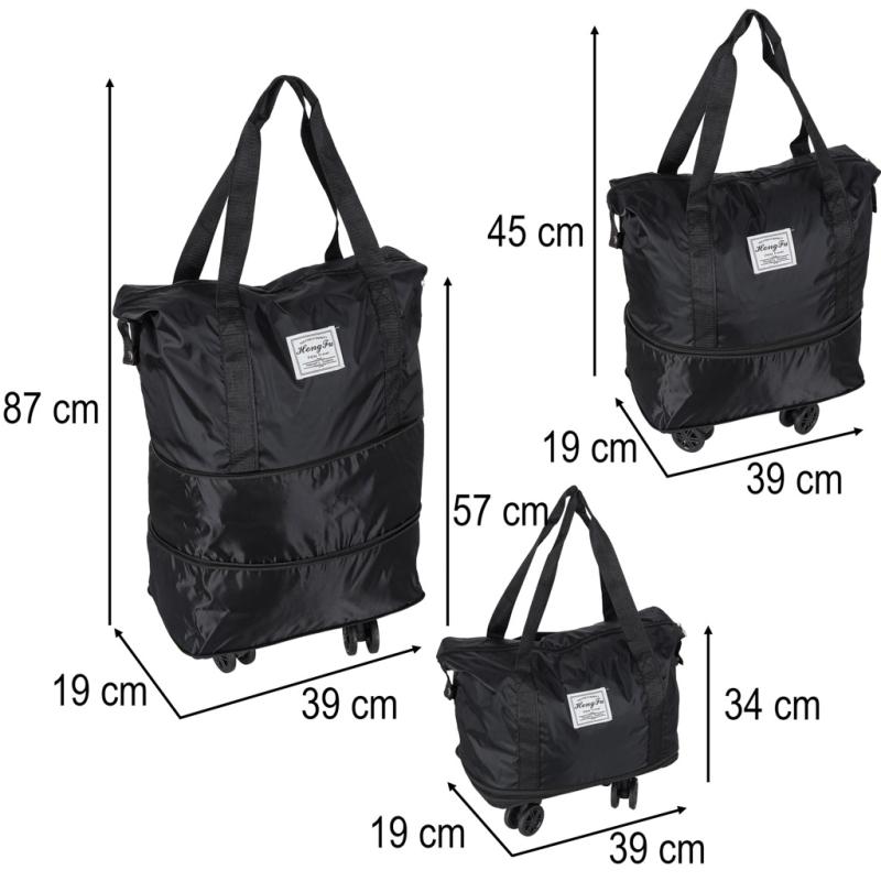 Torba podróżna na kółkach składana turystyczna pojemna 3 rozmiary czarna wykonana z wodoodpornego poliestru Oxford. Posiada trzy rozmiary: złożona 34×54×19 cm, średnio rozłożona 45×39×19 cm oraz całkowicie rozłożona 57×54×19 cm wysokości torby, z całkowitą wysokością 87 cm wraz z rączkami. Koła PVC obrotowe 360°, wyjmowane, osadzone na solidnych szynach. Wewnątrz jedna kieszeń na zamek i dwie otwarte, zewnętrzna kieszonka na zamek oraz dwa zaczepki boczne. Zamknięcie na zamek błyskawiczny. Pojemność około 50 litrów. Produkt praktyczny do podróży i szybkiego przechowywania.