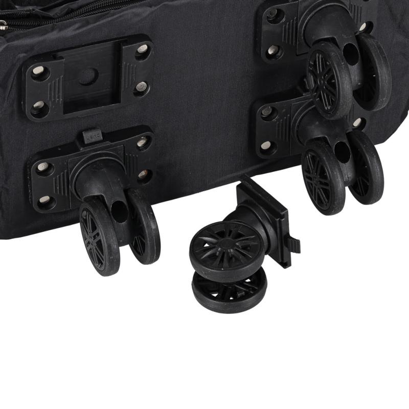 Składana konstrukcja pozwala na szybkie zmniejszenie wymiarów torby, co pozwala zaoszczędzić miejsce podczas przechowywania. Obrotowe o 360° koła z tworzywa PVC zapewniają łatwość prowadzenia w każdych warunkach, a solidne szyny gwarantują stabilność całej konstrukcji. Dodatkowa zewnętrzna kieszeń zamykana na zamek oraz boczne zaczepki podnoszą wygodę organizacji drobiazgów i ułatwiają dostęp do niezbędnych przedmiotów.