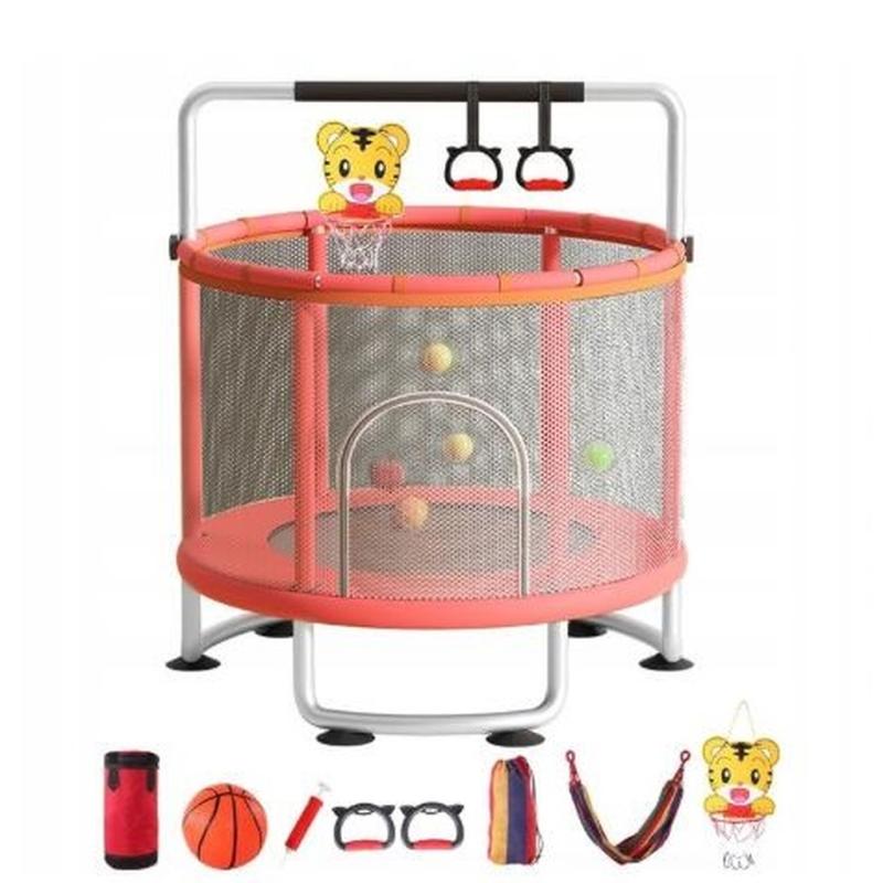 Model Trampolina ogrodowa KIK Junior 150 cm czerwona został zaprojektowany tak, by zwykłe skakanie przerodzić się w wielowątkową zabawę. W komplecie znajduje się tarcza koszykarska z motywem tygryska i piłka z pompką, 12 kolorowych piłeczek, worek bokserski z parą rękawiczek oraz hamak z torbą do przechowywania — każde z tych akcesoriów poszerza możliwości zabawy i treningu koordynacji.