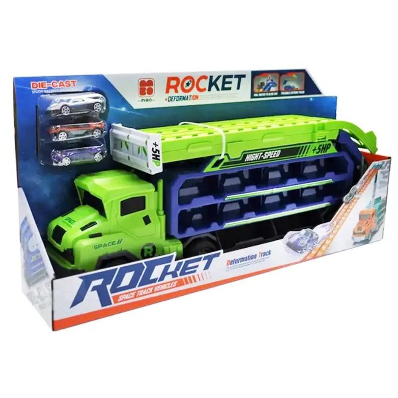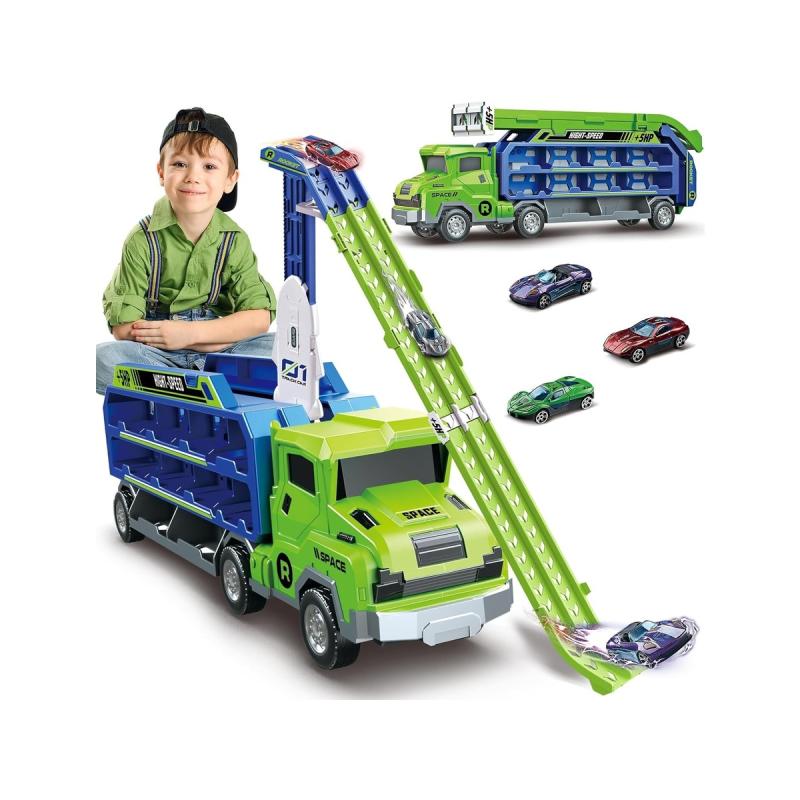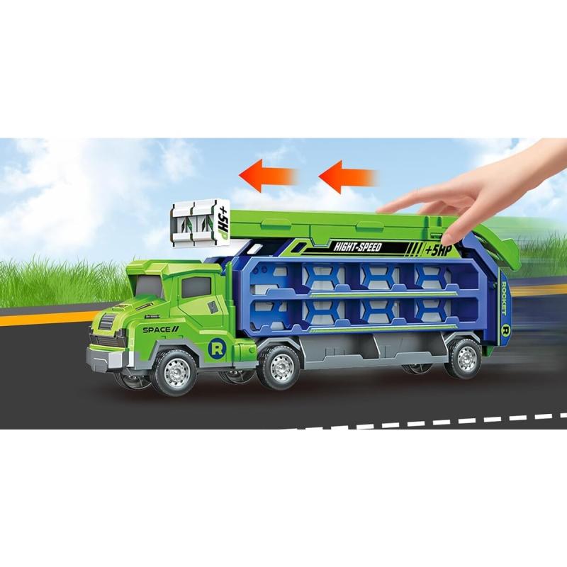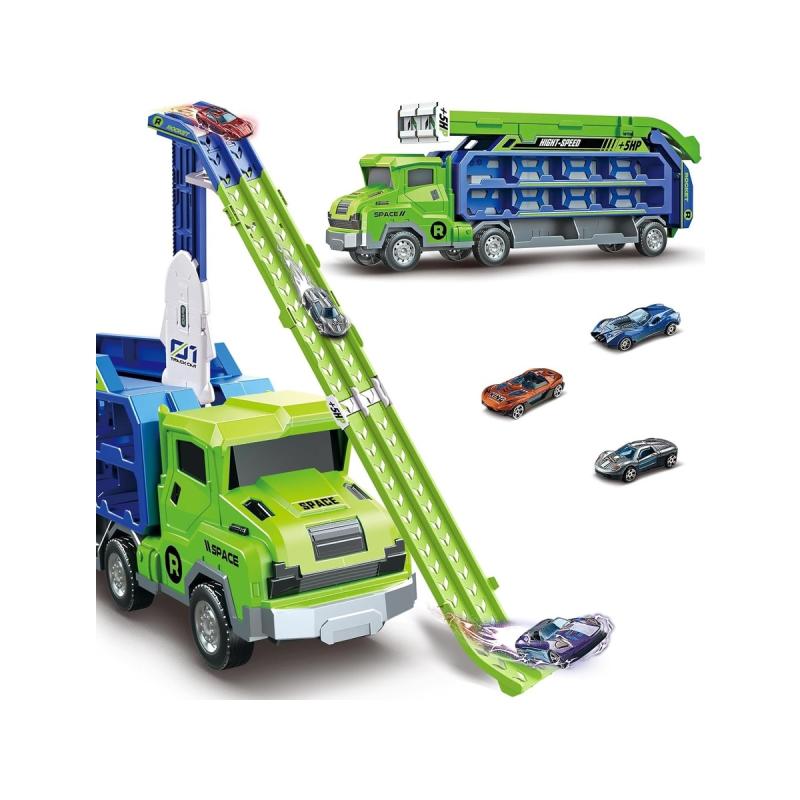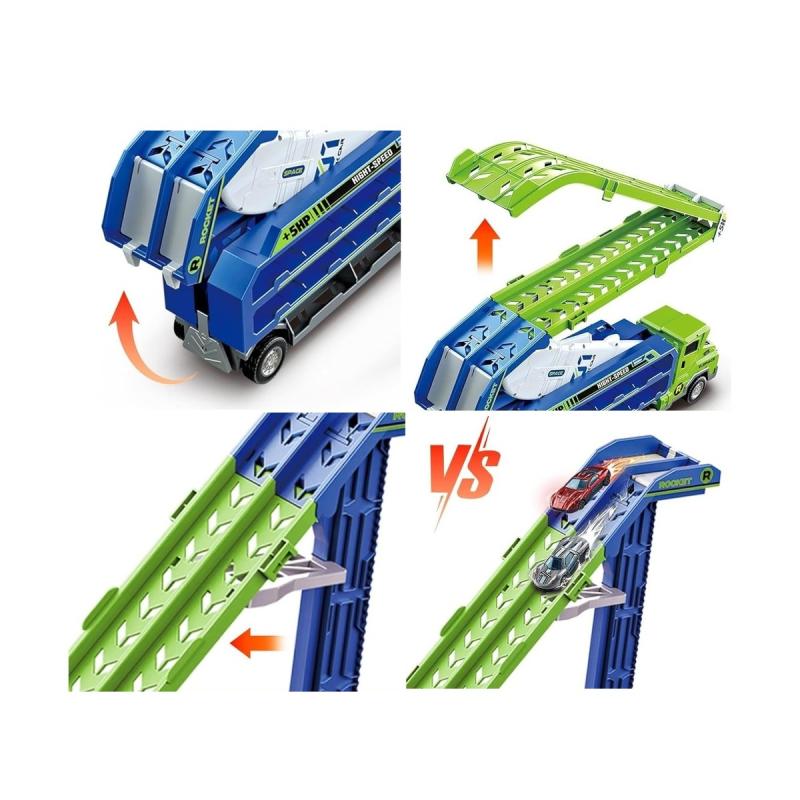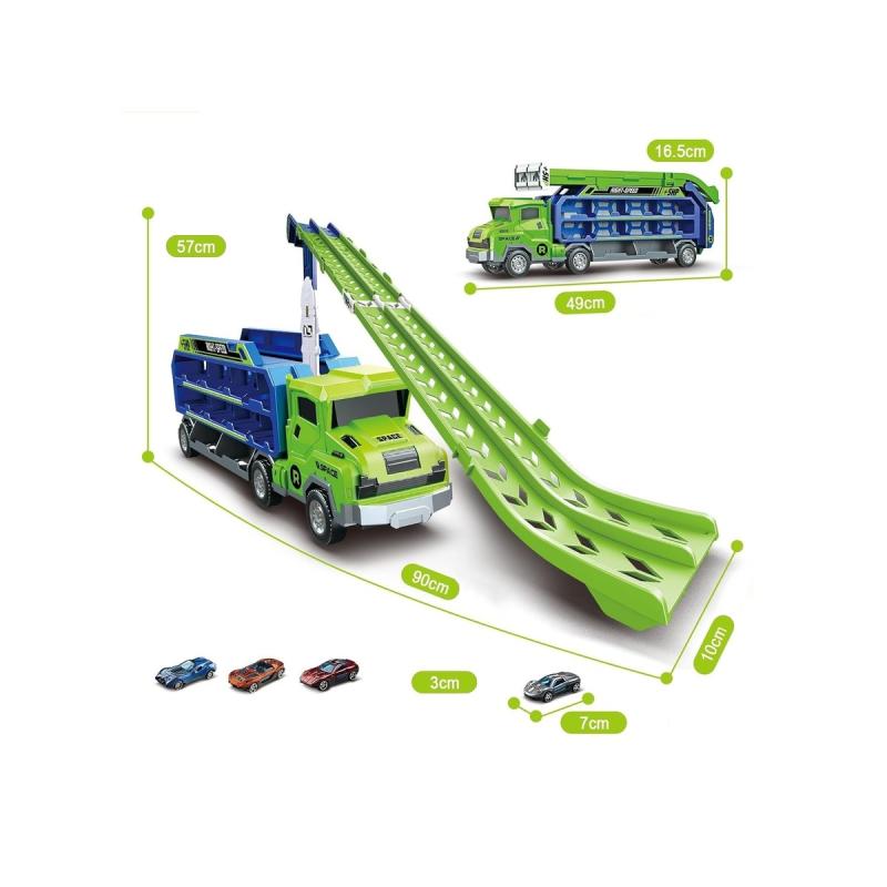 Ciężarówka transporter z wyrzutnią — duża zabawka 49 × 16,5 × 10 cm z wyrzutnią i 3 resorakami, gotowa do natychmiastowej zabawy. Pojazd działa jako laweta, garaż i tor z zjeżdżalnią; jeden przycisk zmienia lawetę w wyrzutnię, a gumowe koła i napęd frakcyjny zapewniają długie, realistyczne przejazdy. Zestaw zawiera 3 unikatowe resoraki (ok. 7 × 3 cm) i oryginalne opakowanie; rozłożony tir zajmuje 90,5 × 57 × 10 cm i oferuje aż 20 miejsc transportowych. Nie wymaga baterii, przeznaczony dla dzieci powyżej 3 lat — idealny do wyścigów i wspólnej zabawy z przyjaciółmi.