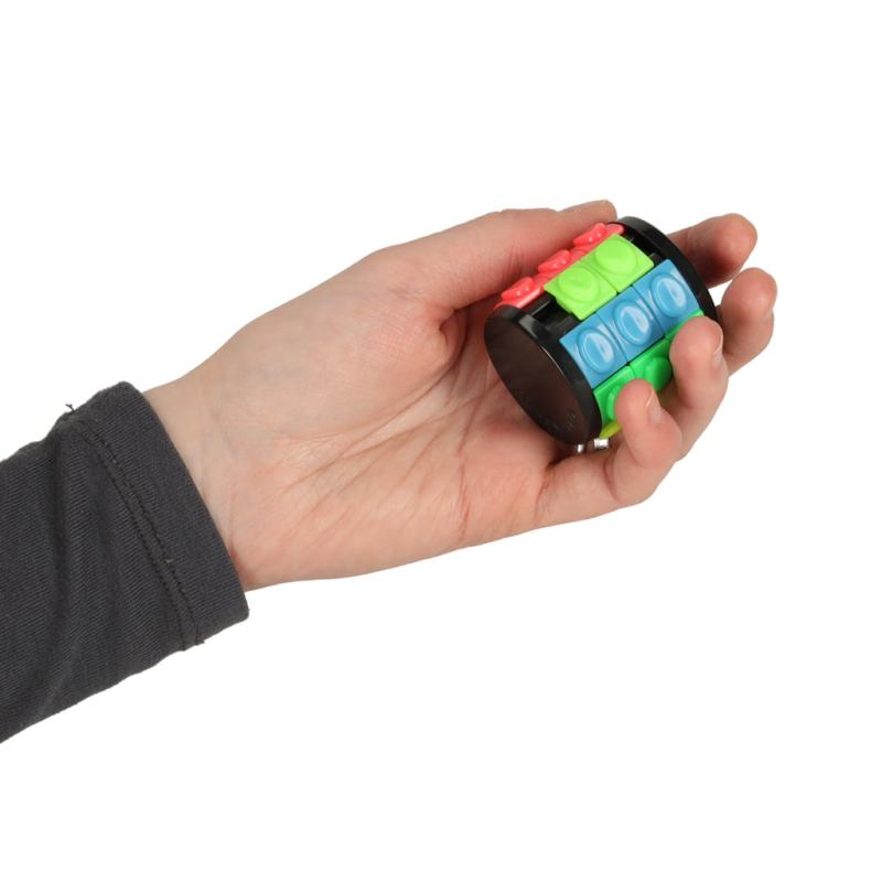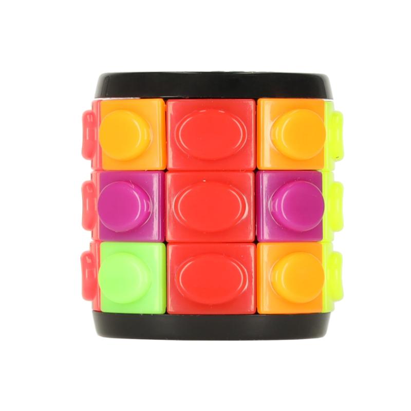 Walec ma konstrukcję z trzema poziomami pierścieni, które można swobodnie obracać, przesuwając kolorowe kostki w obrębie obudowy. Celem jest uporządkowanie elementów tak, by w jednym rzędzie znalazły się identyczne kolory — ruch umożliwia wolne miejsce w pojedynczym rzędzie, co dodaje łamigłówce dynamiki i wymaga planowania kilku kroków naprzód. Prosty mechanizm obracania sprawia, że zabawka jest intuicyjna zarówno dla dzieci, jak i dorosłych.
