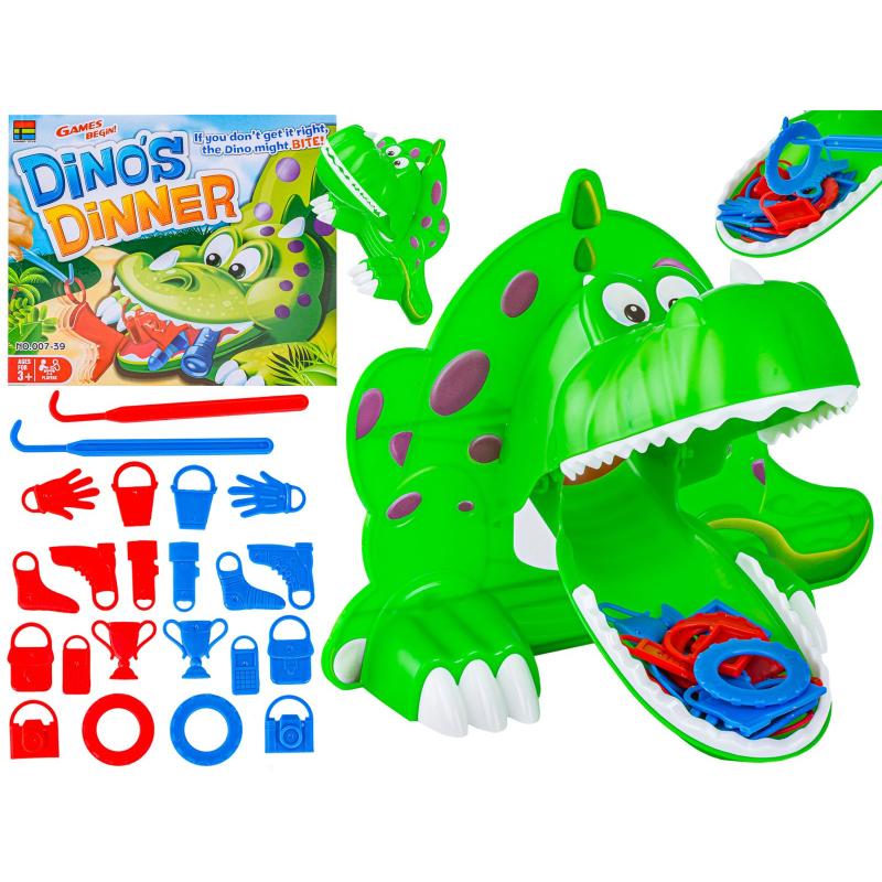 W pudełku znajdziesz elementy do złożenia dinozaura, który po zmontowaniu staje się centrum rozgrywki. Ustawia się otwartą paszczę i wsypuje wszystkie 20 przedmiotów do zebrania; gracze w wieku powyżej 3 roku życia, w liczbie od 2 do 4, kolejno używają chwytaków, by wyciągać rzeczy z wnętrza. Proste zasady kryją napięcie — dinozaur „nie lubi” oddawać swojej zdobyczy i może zamknąć paszczę w najmniej oczekiwanym momencie, co kończy rundę.