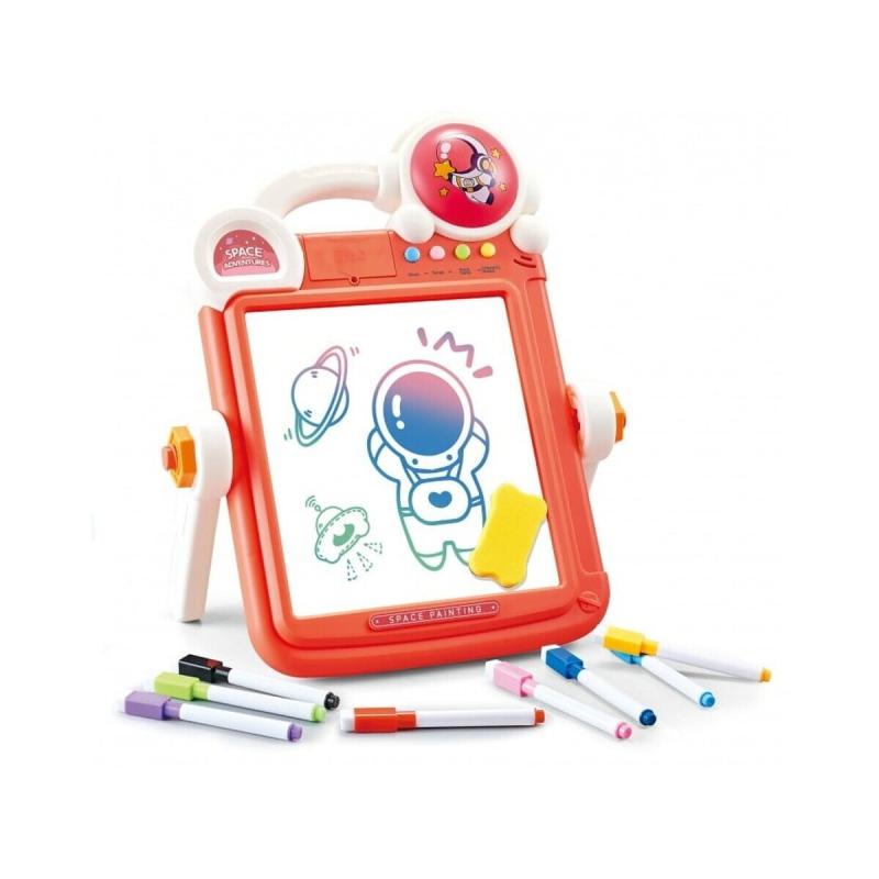 Tablica 2w1 czerwona — 36 zmazywalnych kart, 8 pisaków i wymiary opakowania 39 × 33,8 × 8 cm, przeznaczona dla dzieci powyżej 3 roku życia. Jedna strona służy do rysowania z gąbeczką do czyszczenia i efektami dźwiękowymi oraz czterema przyciskami melodyjek, druga to układanka z kolorowymi klockami do tworzenia obrazków i dopasowywania kształtów. Wykonana z atestowanego, bezpiecznego tworzywa, bez ostrych krawędzi, z europejskim certyfikatem CE. Zestaw rozwija wyobraźnię, zdolności manualne i koordynację wzrokowo-ruchową, świetny na prezent edukacyjny i zabawkę sprzyjającą kreatywnej nauce przez zabawę.