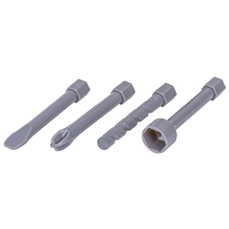 Do zestawu dołączone są 4 wymienne nasadki, które rozszerzają zakres zabawy i uczą rozróżniania końcówek oraz zasad posługiwania się nimi. Całość zapakowana jest w oryginalne opakowanie o rozmiarach 21,5 × 17,5 × 6 cm, dzięki czemu zestaw nadaje się również na prezent.