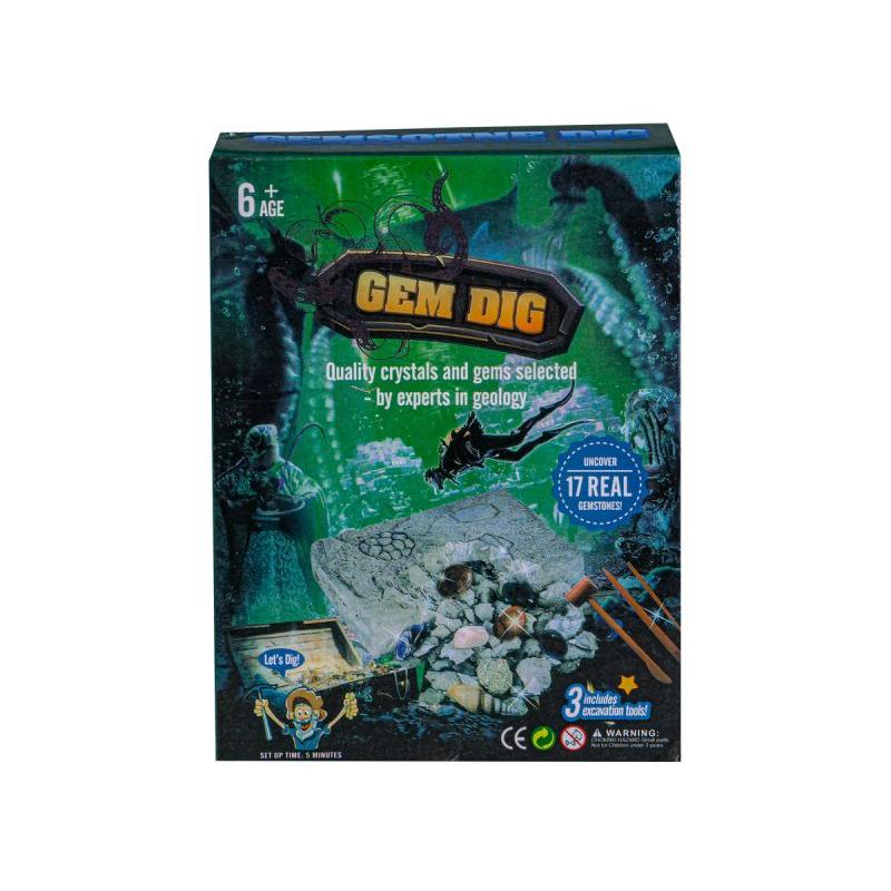 Wykopaliska — Kopalnia Kryształów i Kamieni, zestaw dla małych odkrywców z 17 skarbami, w opakowaniu 18,3 × 14,2 × 4,5 cm, przeznaczony dla dzieci powyżej 6 lat. Zabawa polega na wykopywaniu ukrytych kamieni z bryłki przy użyciu narzędzi, co rozwija zręczność, koncentrację i koordynację wzrokowo-ruchową; symulacja wykopalisk angażuje cierpliwość i ciekawość. W zestawie znajduje się bryłka skamieliny z ukrytymi skarbami, 3 narzędzia oraz oryginalne opakowanie; do odkrycia jest 17 elementów (kamienie i muszelki). Idealne jako edukacyjna zabawka, która uczy cierpliwości i manualnych umiejętności; zalecane okulary ochronne.